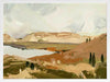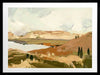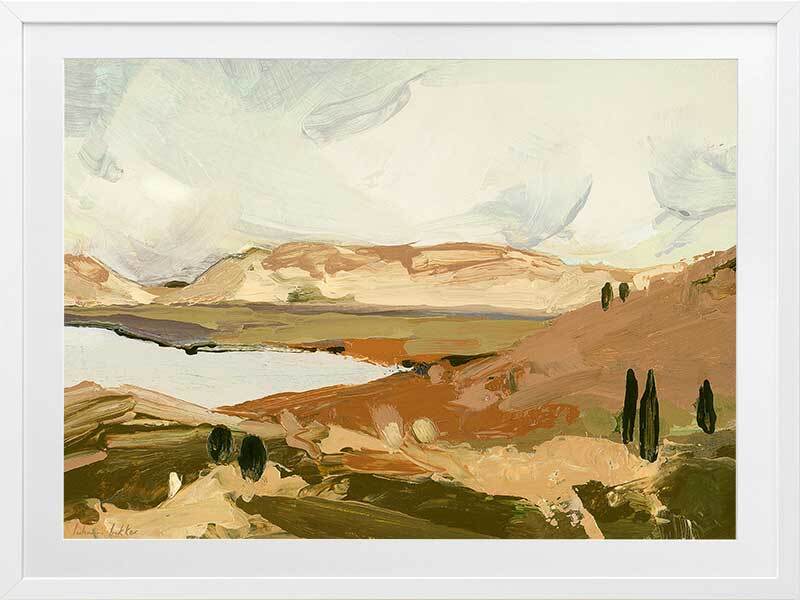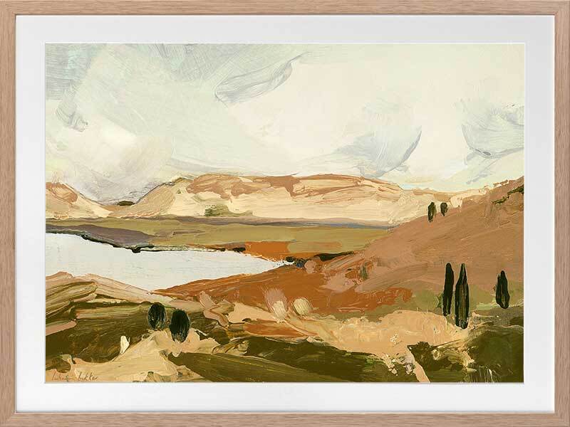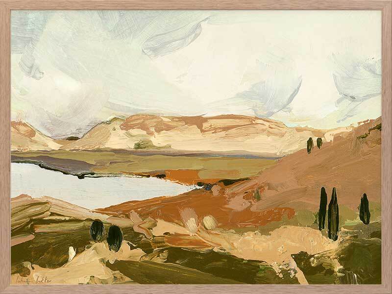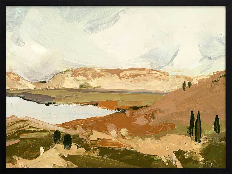 Glory Days Framed Art Print - The warm, orange sunlight hits the mountain peaks just-so. A calming piece representing wild hilltops, a lake, and the cloudy sky, this artwork is perfect for bringing a sense of calm to any space, with warm beige and brown tones, blended with deep khaki green, and softened blue.