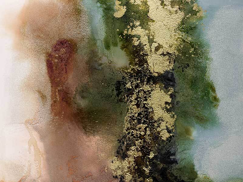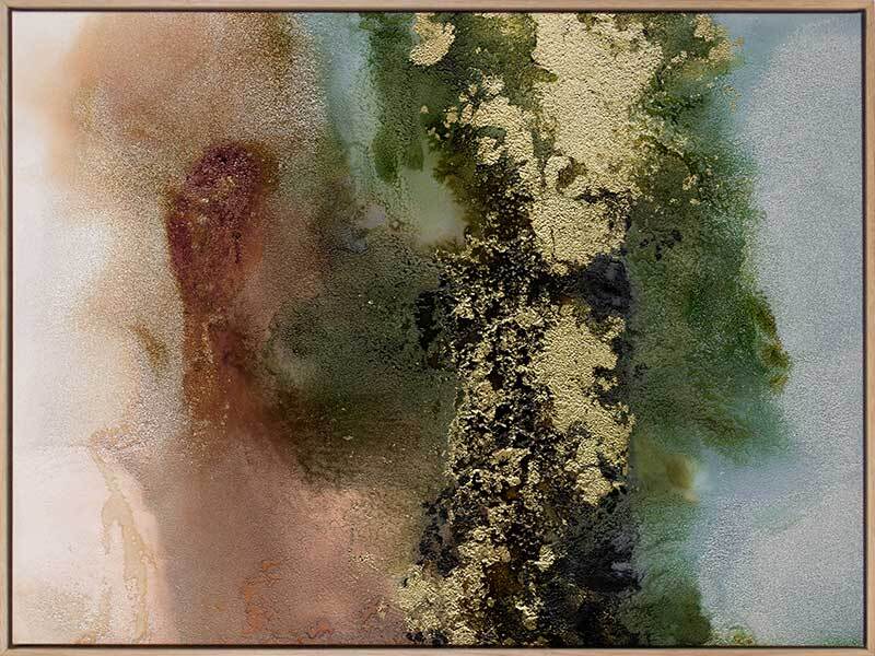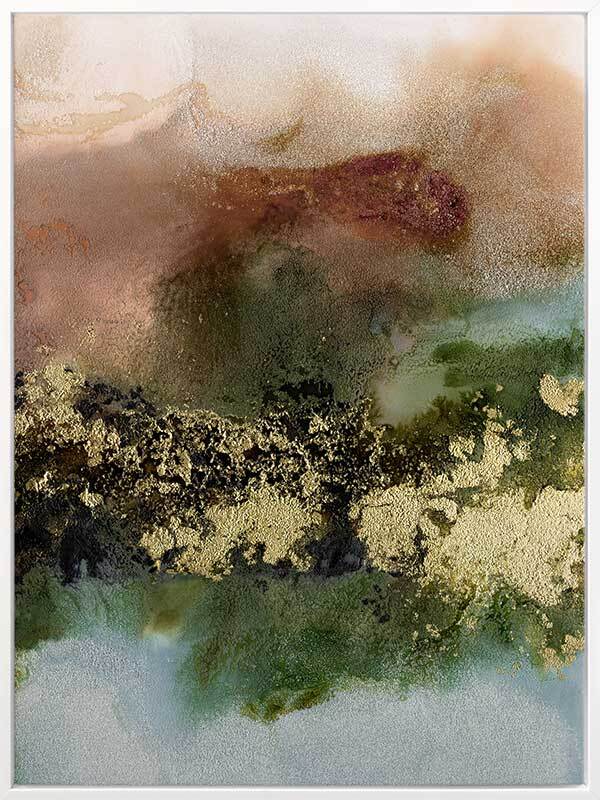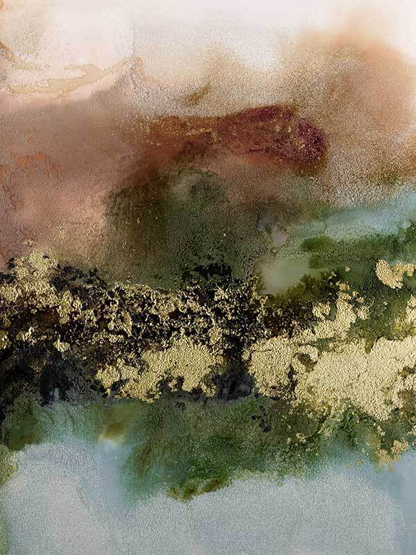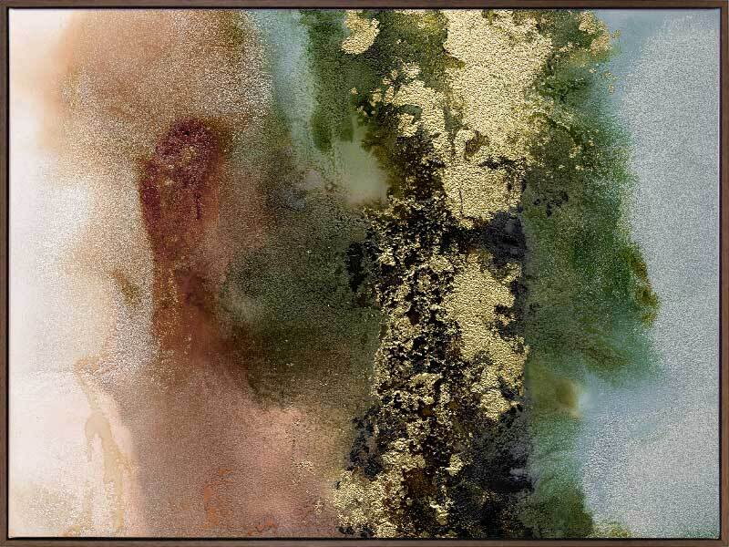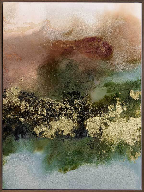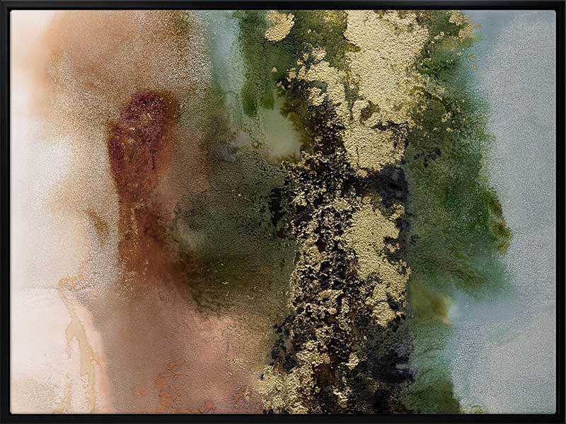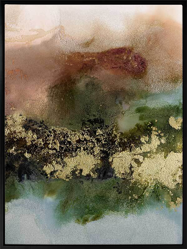Gold Fever I Canvas Art Print - A richly textured abstract artwork featuring a blend of warm, earthy tones in rust brown, khaki green and soft blue, accented with flecks of gold. Matches with Gold Fever II, III and IV.