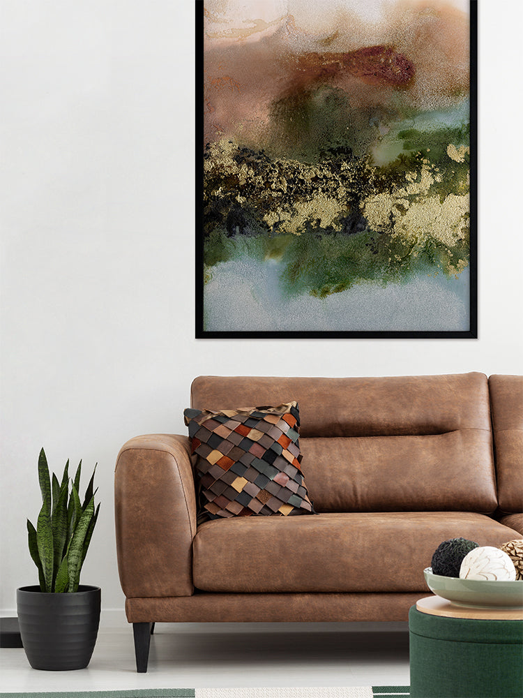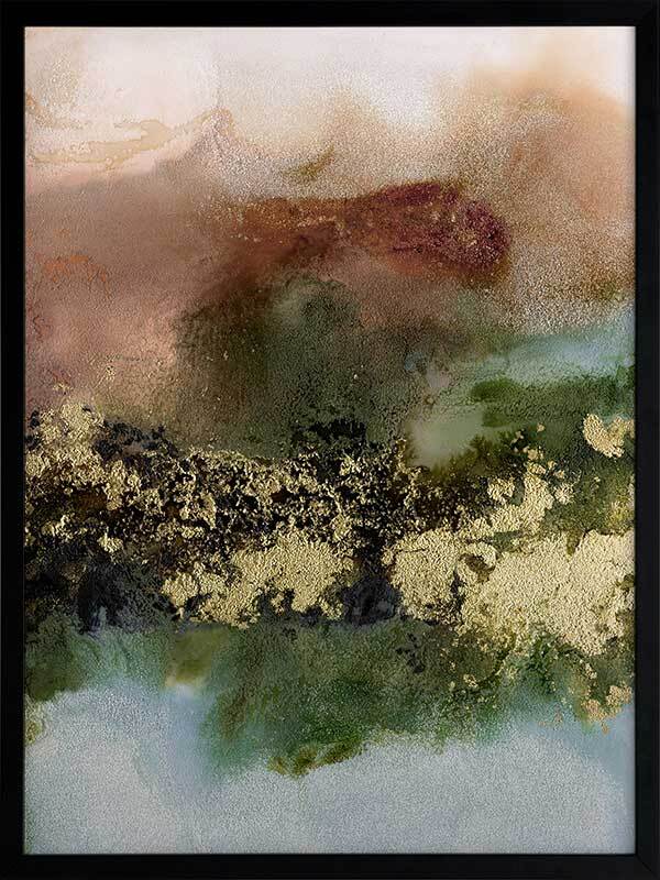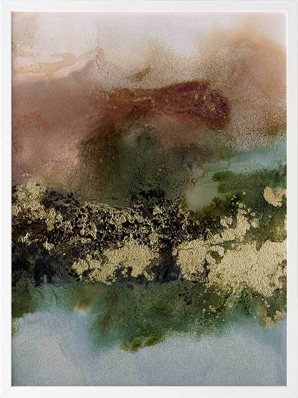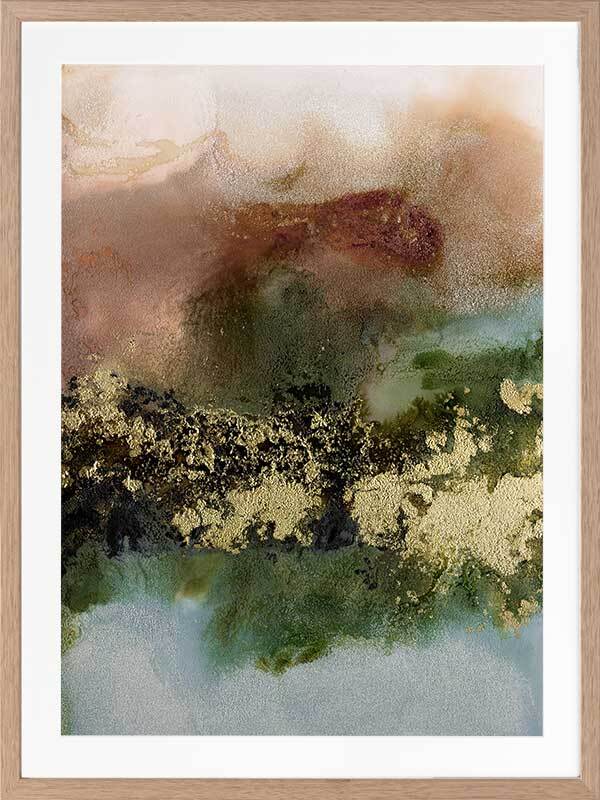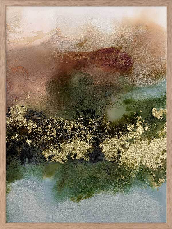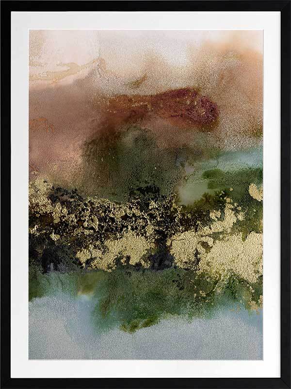 Gold Fever I Framed Art Print - A richly textured abstract artwork featuring a blend of warm, earthy tones in rust brown, khaki green and soft blue, accented with flecks of gold. Matches with Gold Fever II, III and IV.