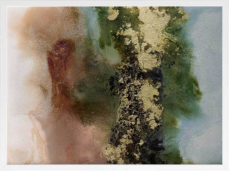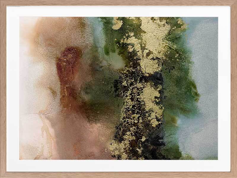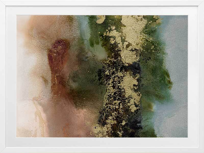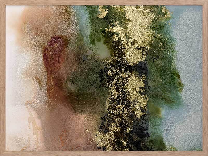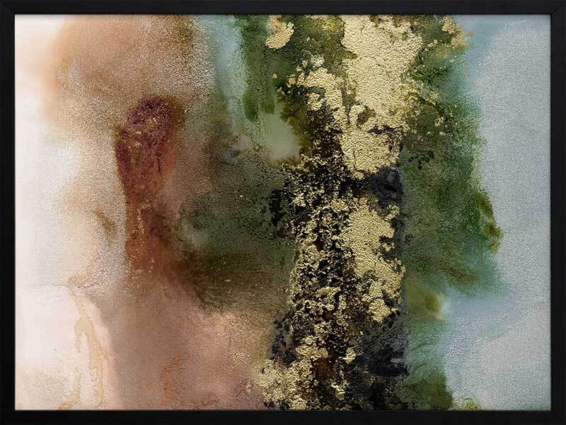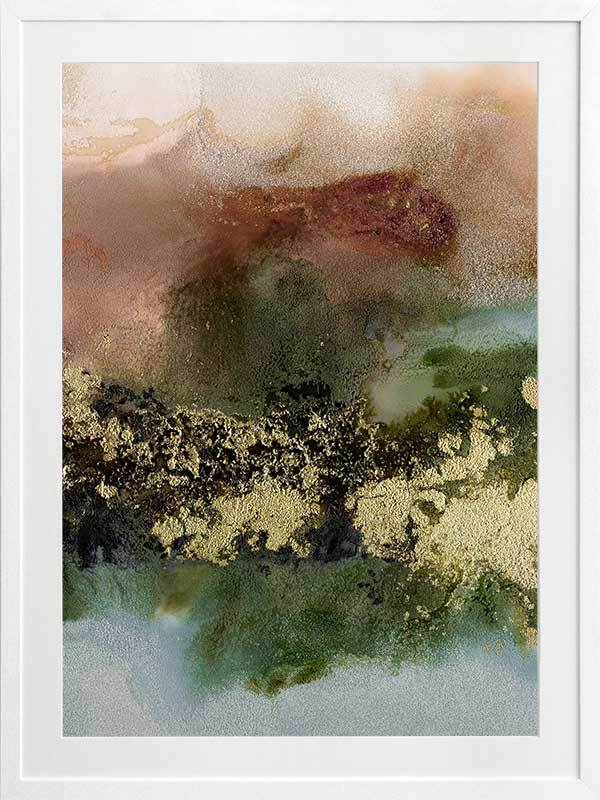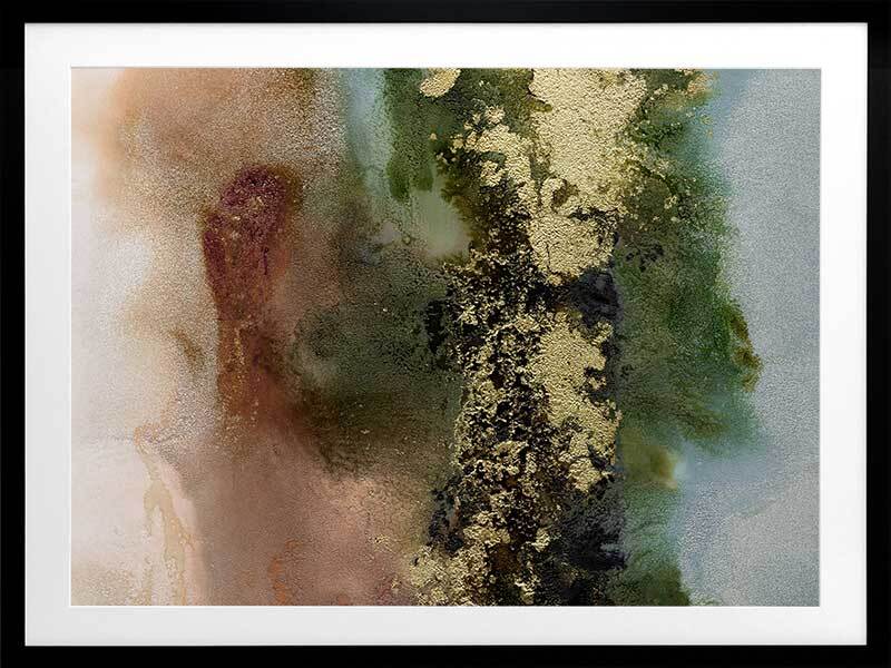 Gold Fever I Framed Art Print - A richly textured abstract artwork featuring a blend of warm, earthy tones in rust brown, khaki green and soft blue, accented with flecks of gold. Matches with Gold Fever II, III and IV.