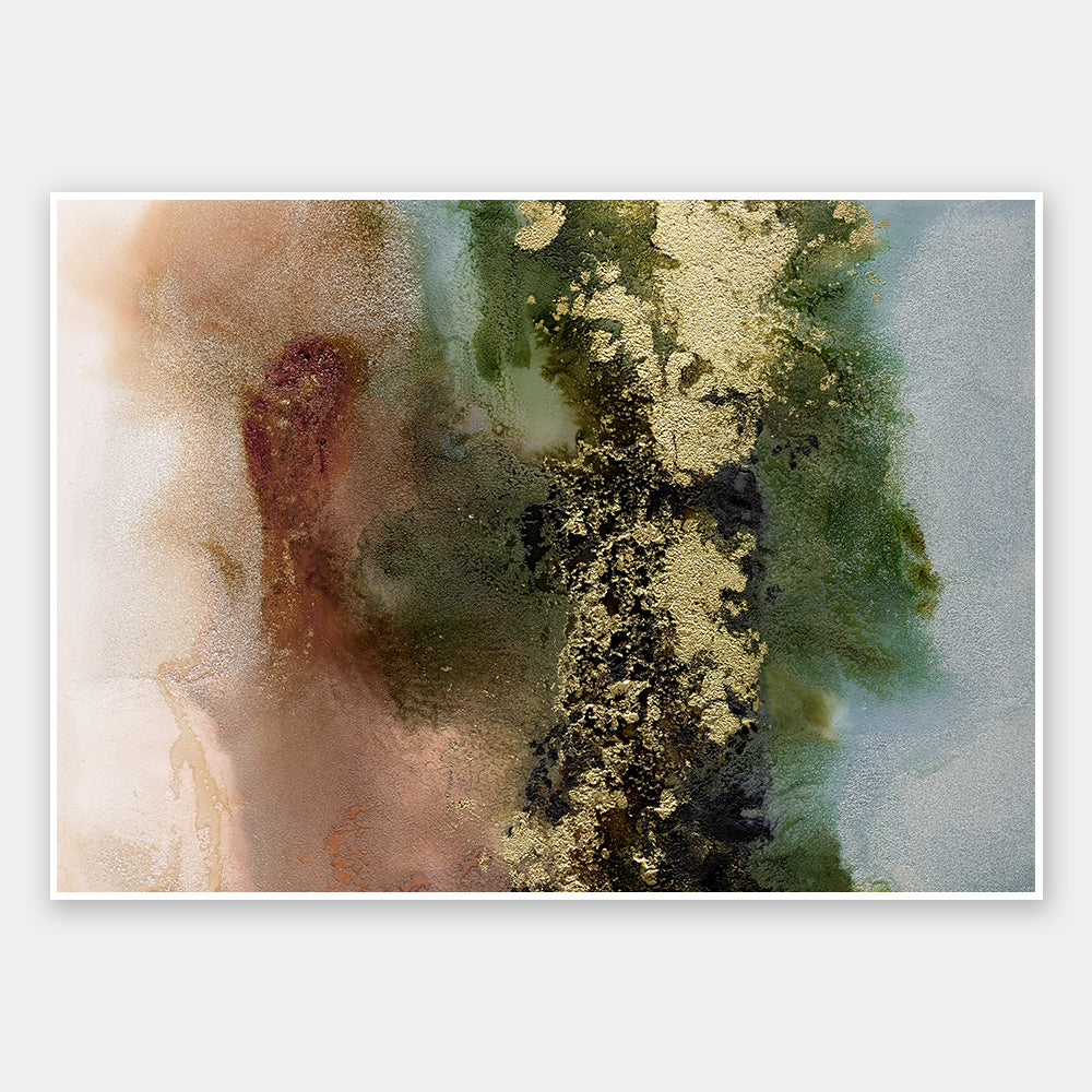Gold Fever I Unframed Art Print - A richly textured abstract artwork featuring a blend of warm, earthy tones in rust brown, khaki green and soft blue, accented with flecks of gold. Matches with Gold Fever II, III and IV.
