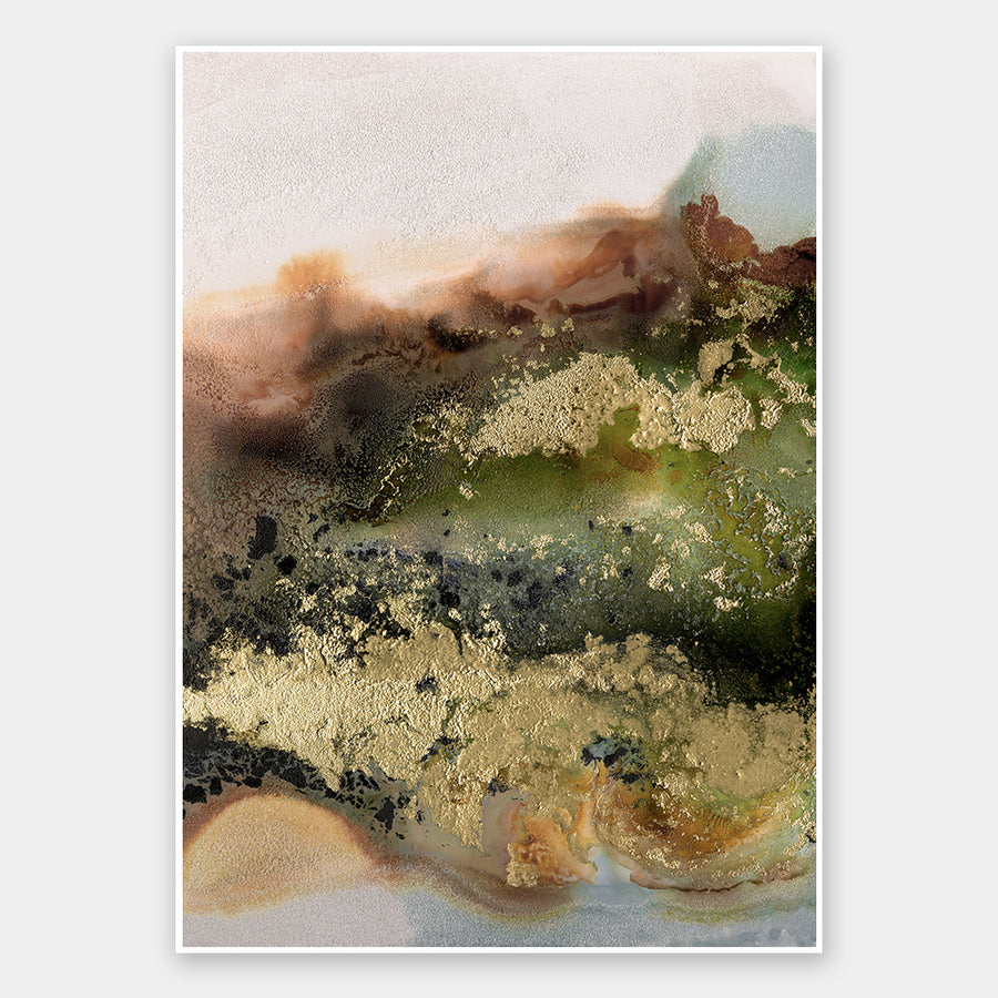 Gold Fever III Unframed Art Print - A richly textured abstract artwork featuring a blend of warm, earthy tones in rust brown, khaki green and deep inky black, accented with flecks of gold. Matches with Gold Fever I, II and IV.
