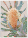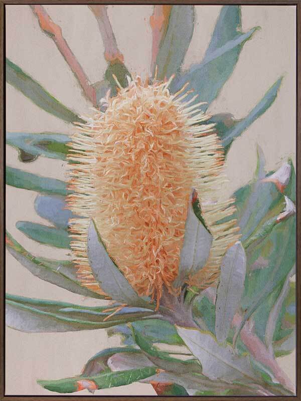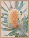Golden Banksia Canvas Art Print: A soft, striking piece featuring a painted Yellow Banksia against a muted beige background. 2019 SPRING/SUMMER COLLECTION: SOLSTICE