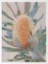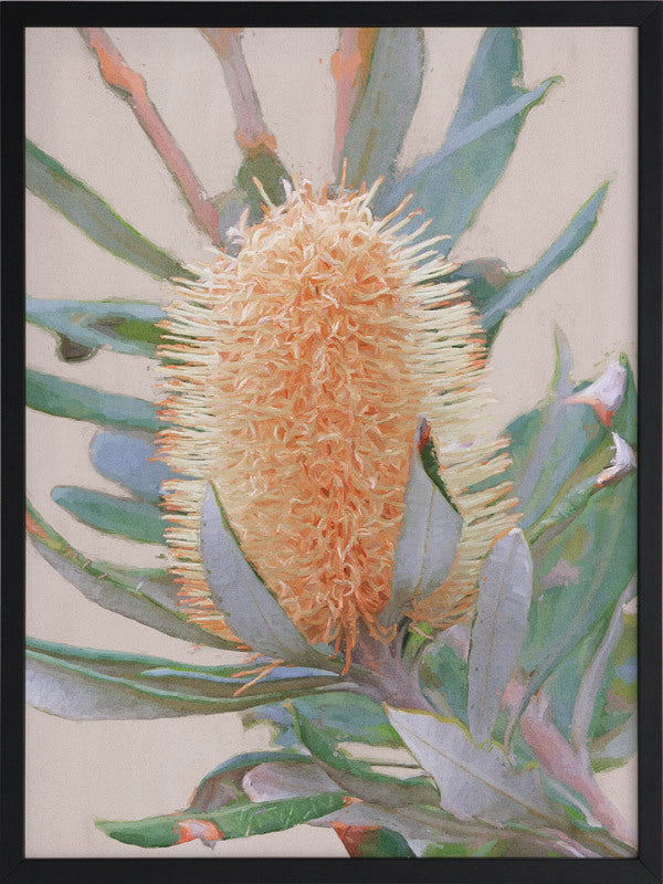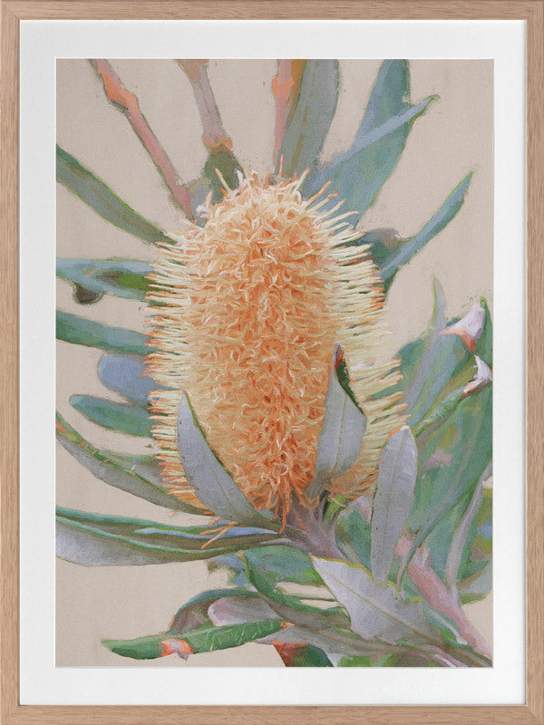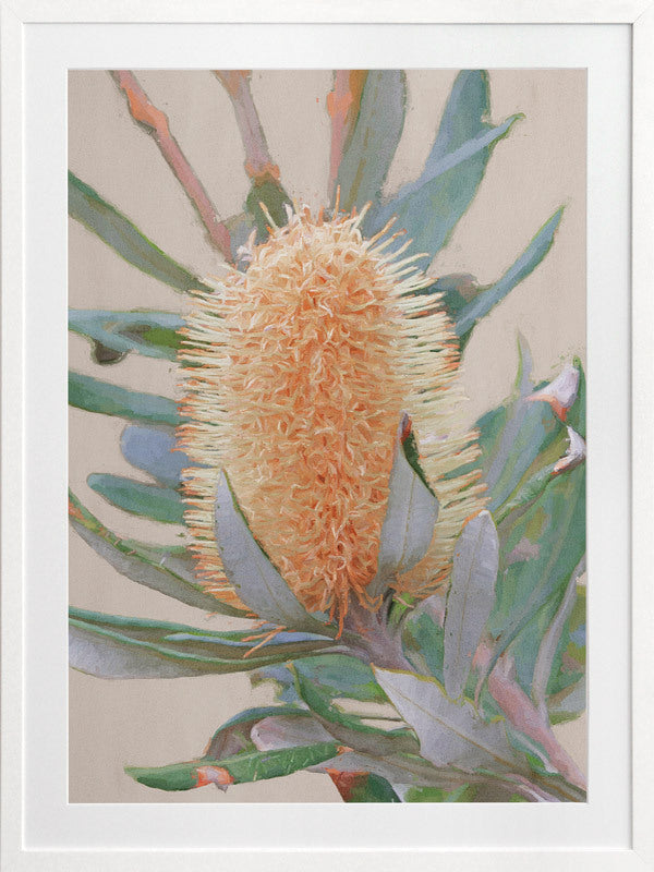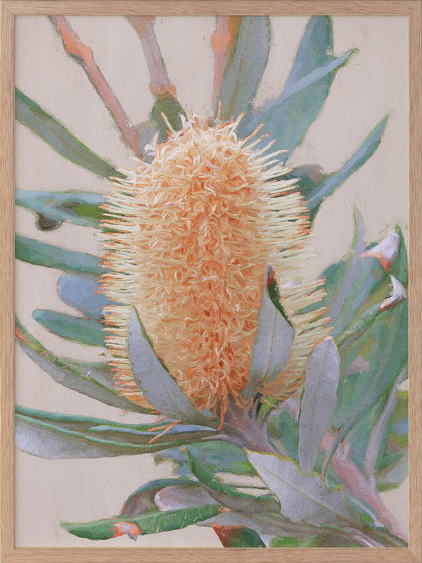 Golden Banksia Framed Print: A soft, striking piece featuring a painted Yellow Banksia against a muted beige background. 2019 SPRING/SUMMER COLLECTION: SOLSTICE