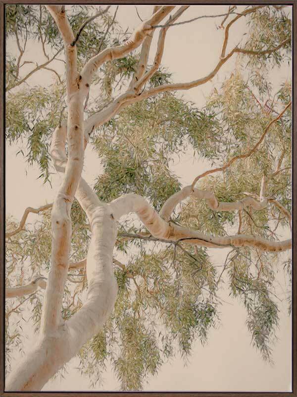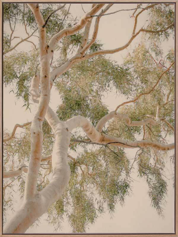 Golden Hour Gum Tree Canvas Art Print - Warm and earthy, this photographic artwork features a towering Eucalyptus tree, its branches and leaves overlapping and entwining to create a beautiful textural maze of soft brown and green.