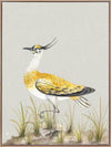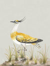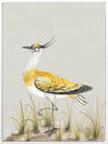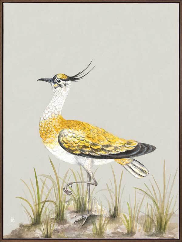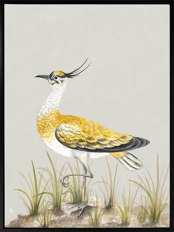 Golden Plover Canvas Art Print - A delightfully detailed work representing the beautiful birds of India. This hand painted, realistic piece features the Golden Plover in all its glory, standing tall with one leg raised, chest puffed, head held high. Each elaborate detail uses realistic colours of golden yellow, black, and creamy white for the bird, with neutral tones for the grass and dirt. Against a light grey background, this piece will suit many interior design styles.