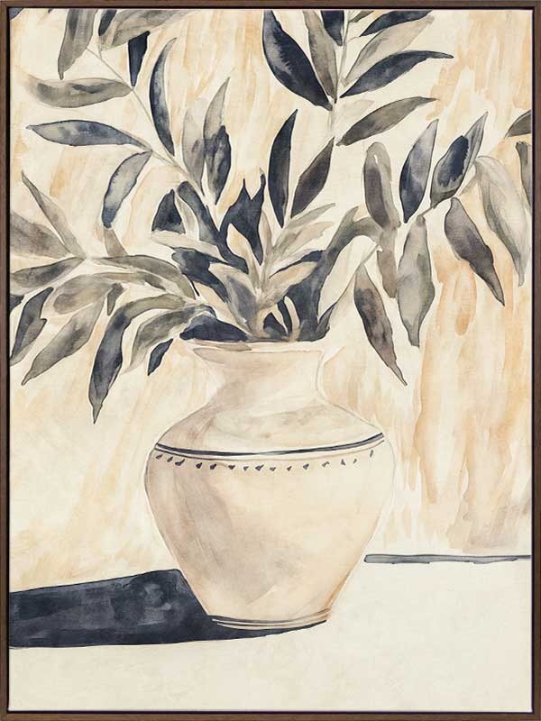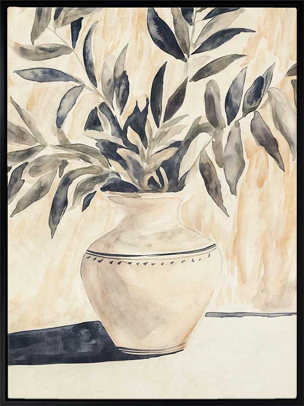 Golden Vase Canvas Art Print - This wall art print embodies contemporary still life elegance, showcasing olive branches in a delicately patterned vase against soft golden beige tones. The painting's gentle, textured brushwork evokes calm sophistication and modern warmth, ideal for interiors seeking subtle botanical charm. This still life artwork brings serene beauty and refined style to your home.