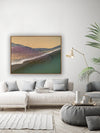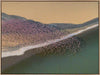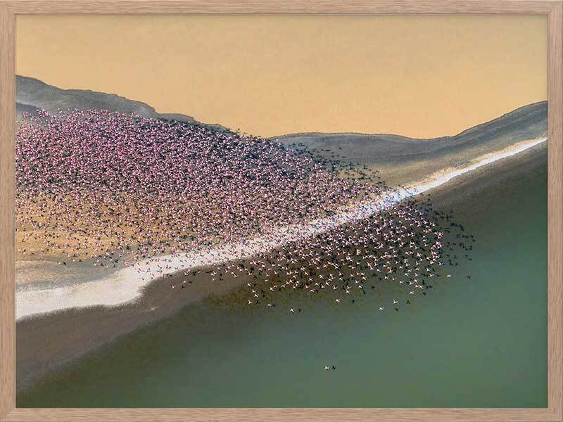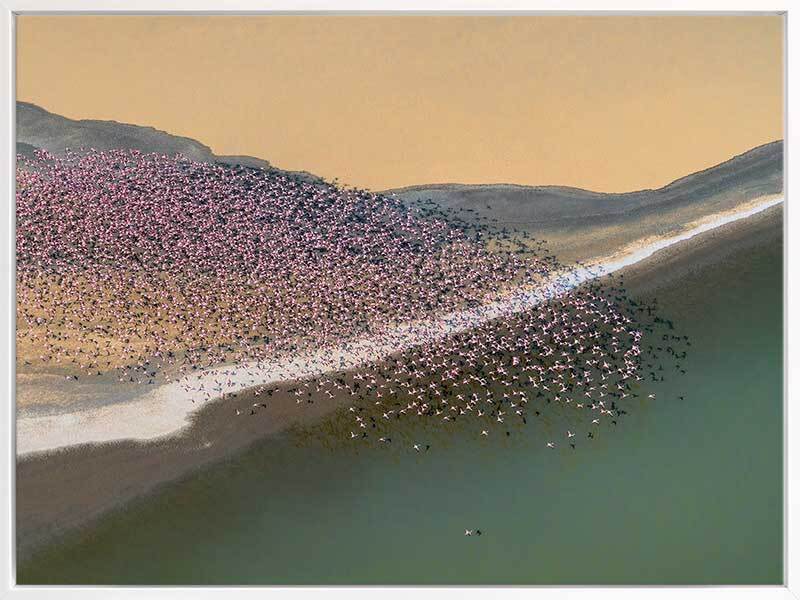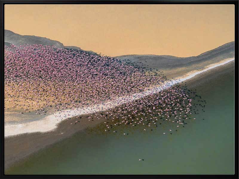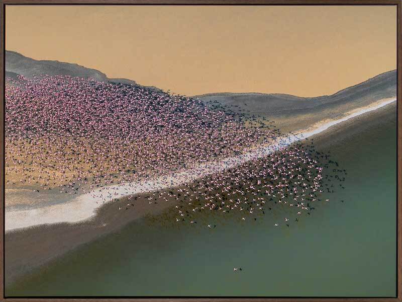 Gone with the Wind Canvas Art Print - A stunning photographic artwork featuring a flock of flamingos flying above a large cream, grey and green coloured lake. THE CURATED SERIES A handpicked gallery of daringly quirky photographic pieces exploding with richness of colour and texture.