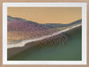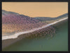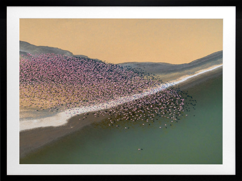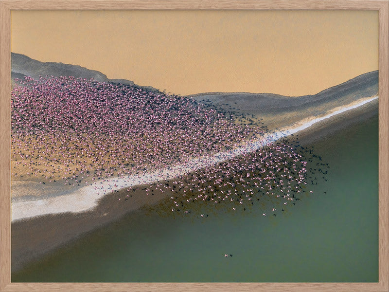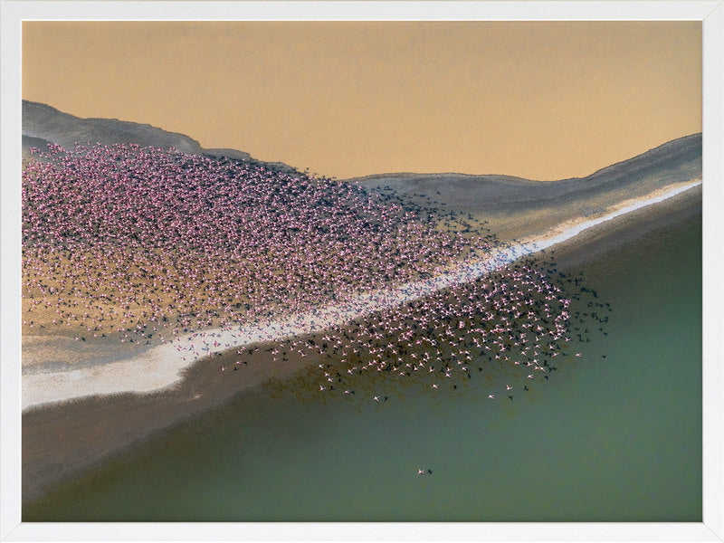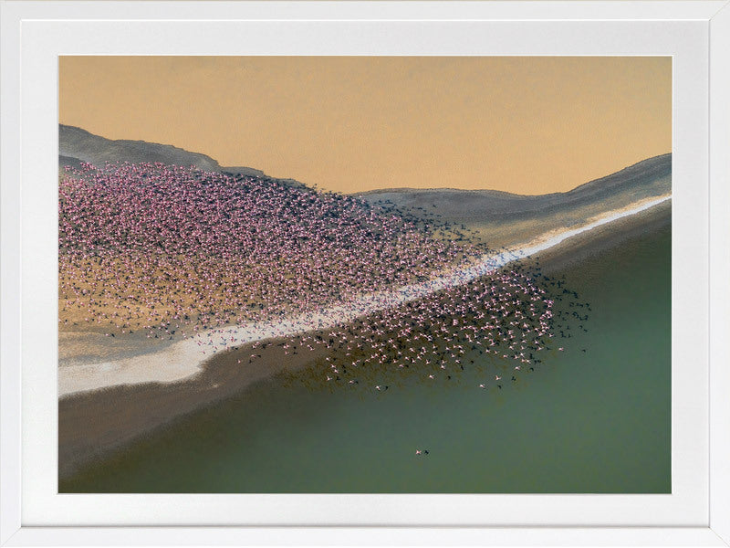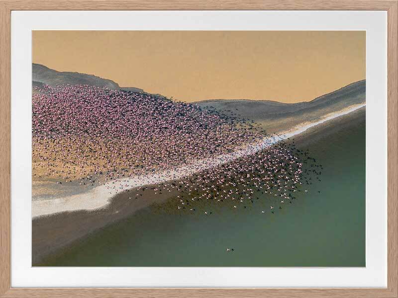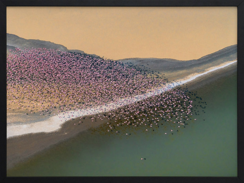 Gone with the Wind Framed Art Print - A stunning photographic artwork featuring a flock of flamingos flying above a large cream, grey and green coloured lake. THE CURATED SERIES A handpicked gallery of daringly quirky photographic pieces exploding with richness of colour and texture.