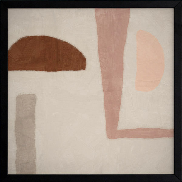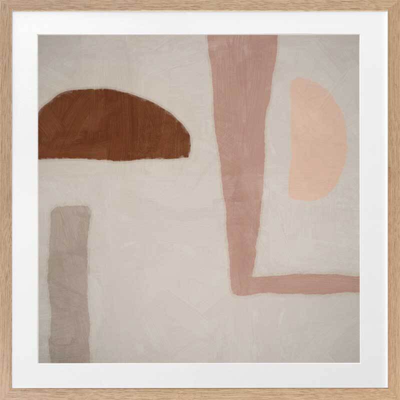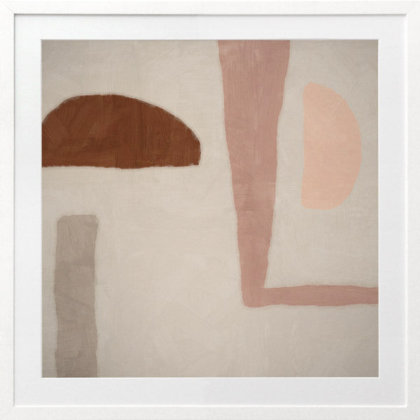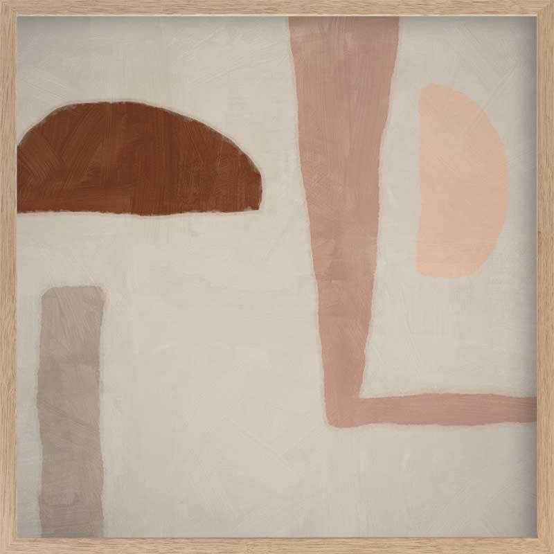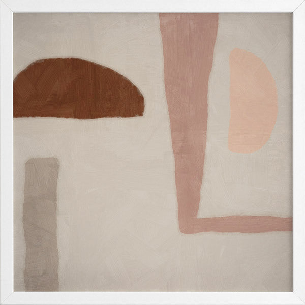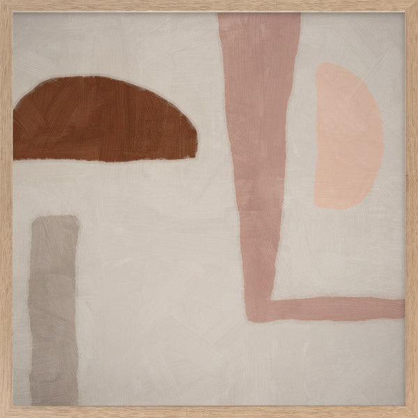 Good Foundation Framed Print: A soft, playful abstract piece that features a mixture of shapes in tones of pink, brown and grey against a neutral grey background. 2019 SPRING/SUMMER COLLECTION: SOLSTICE