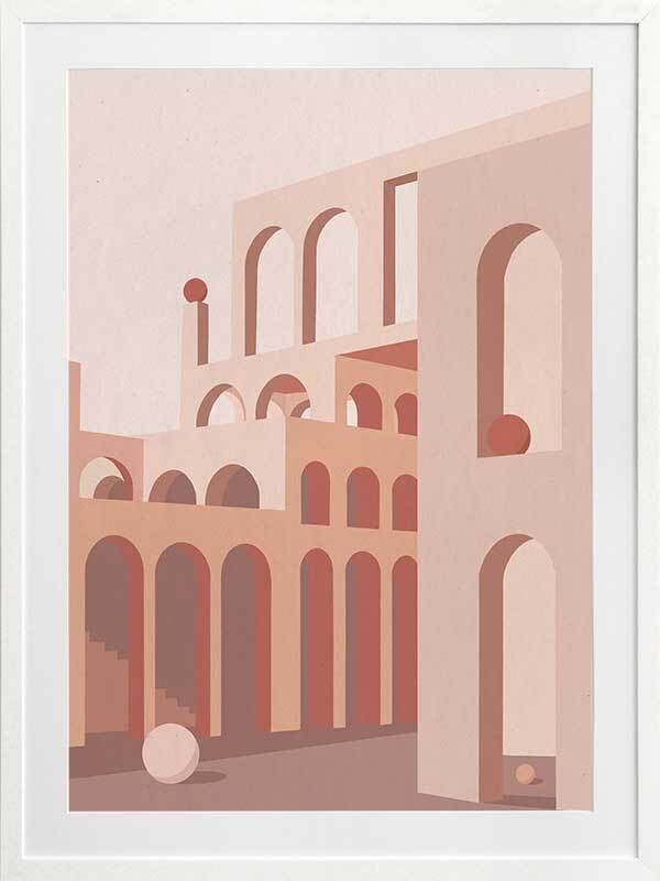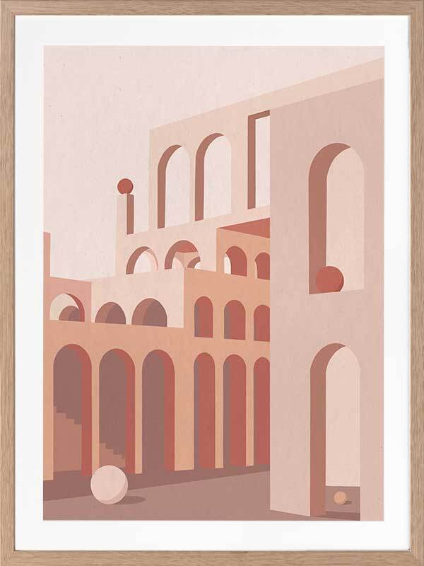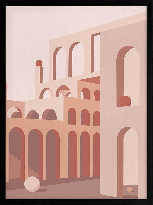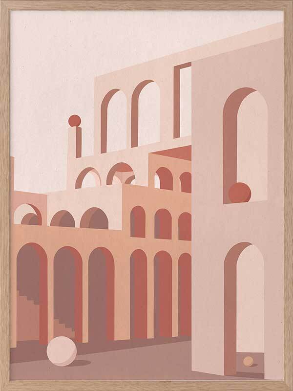 Grand Designs Framed Art Print - A visually stunning architectural illustration featuring colourblocked archways in a warm, terracotta and clay toned colour palette.