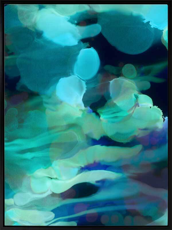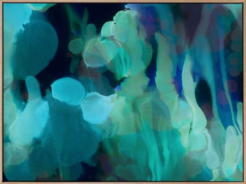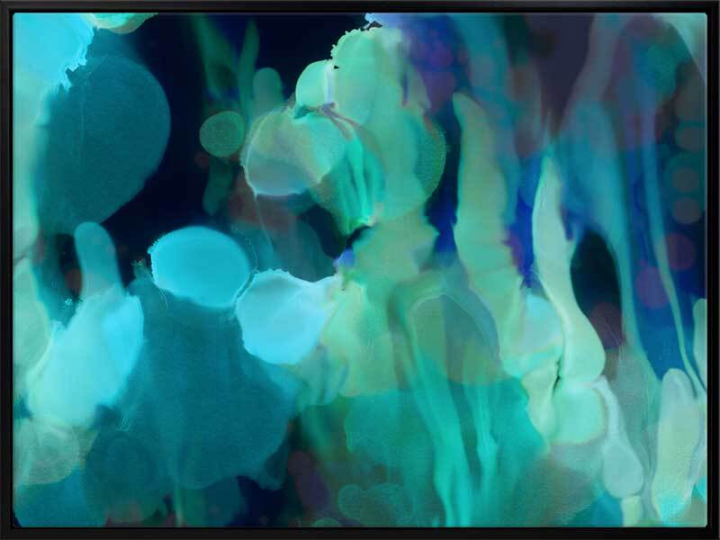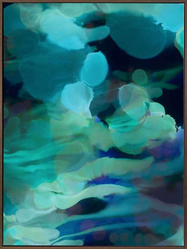 Green Lights Canvas Art Print: For some, this captivating image evokes memories of the spectacular Northern Lights against a cool night sky. For others, green and blue flames dancing in a fireplace. Here the artist achieves a rare combination of luminous colour, darkness and depth in one stunning statement piece. 2014 SPRING/SUMMER COLLECTION: THE FIRST COLLECTION