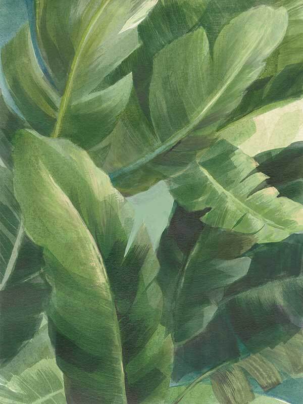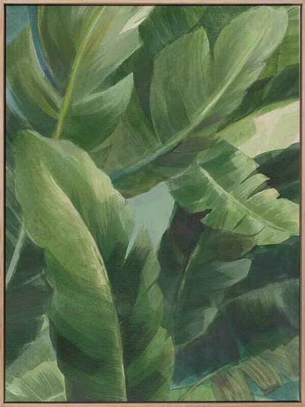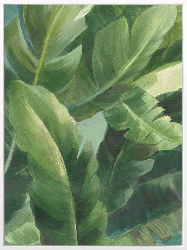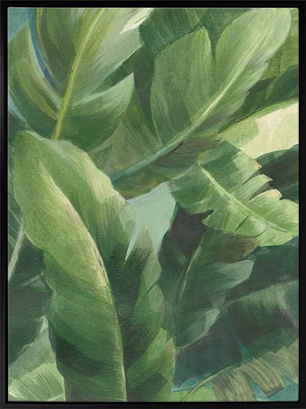 Greenport II Canvas Art Print - Gentle and calming, this lush, tropical artwork features layers of painted banana palm leaves in a fresh green colour palette. Pairs with Greenport I.
