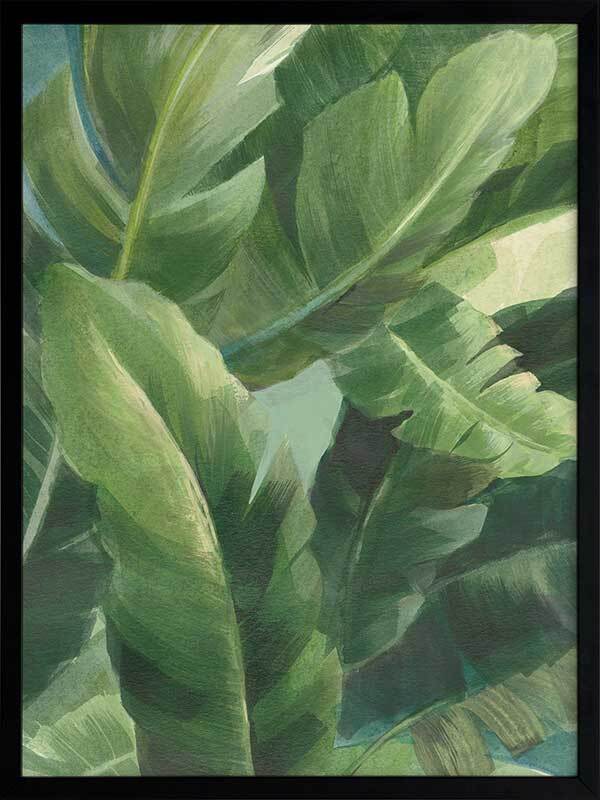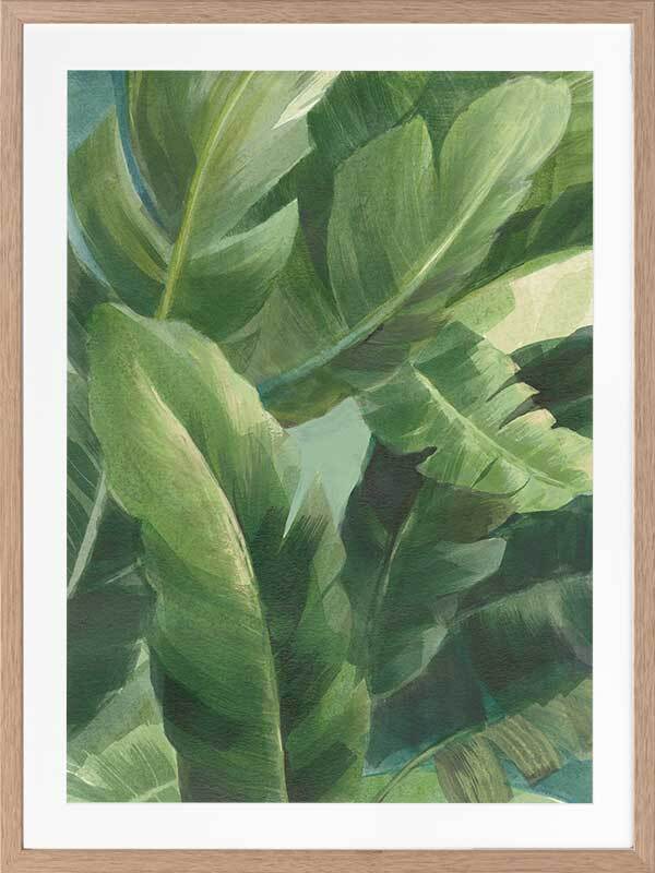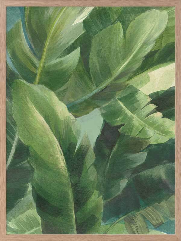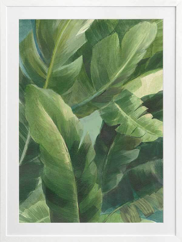 Greenport II Framed Art Print - Gentle and calming, this lush, tropical artwork features layers of painted banana palm leaves in a fresh green colour palette. Pairs with Greenport I.