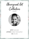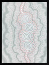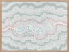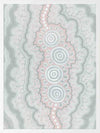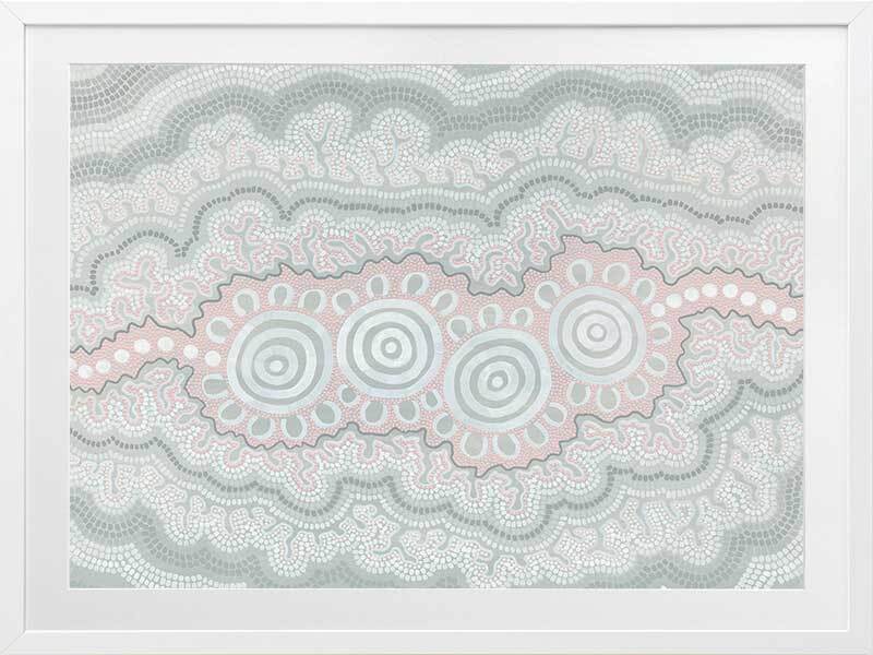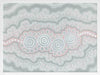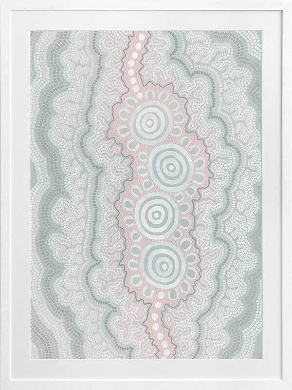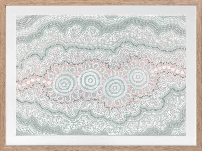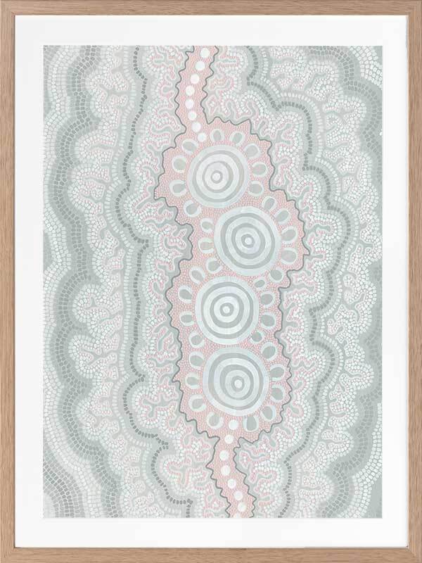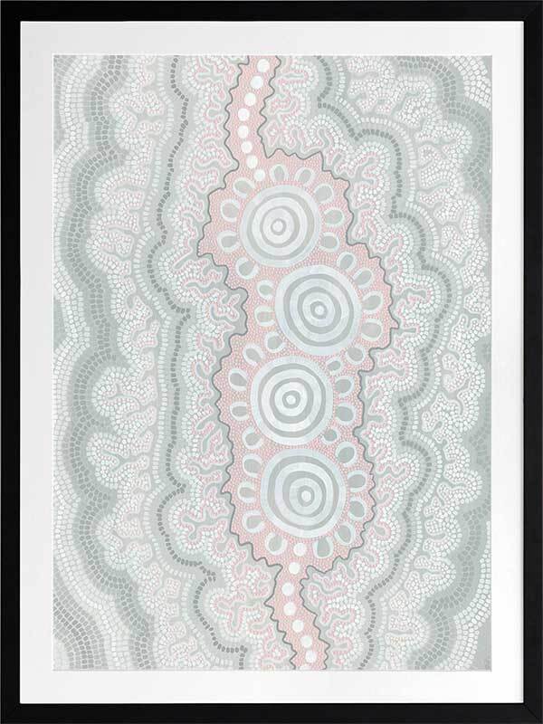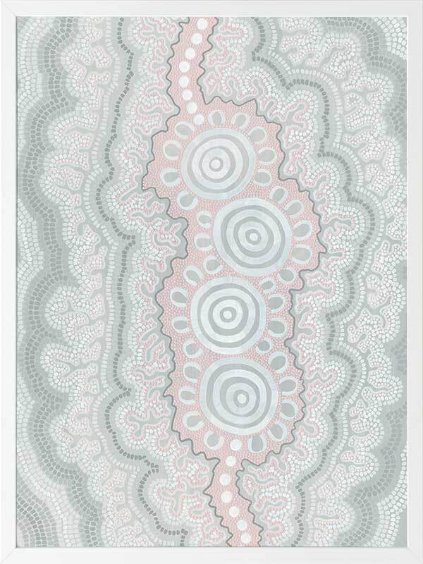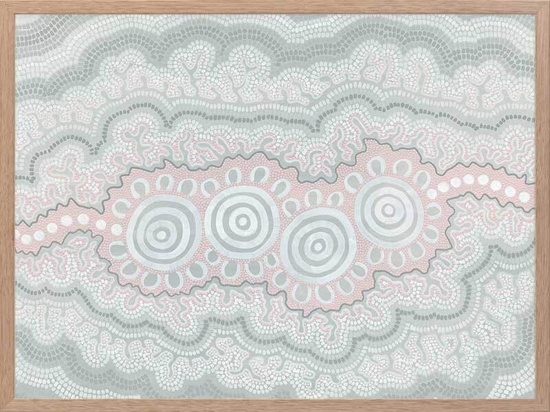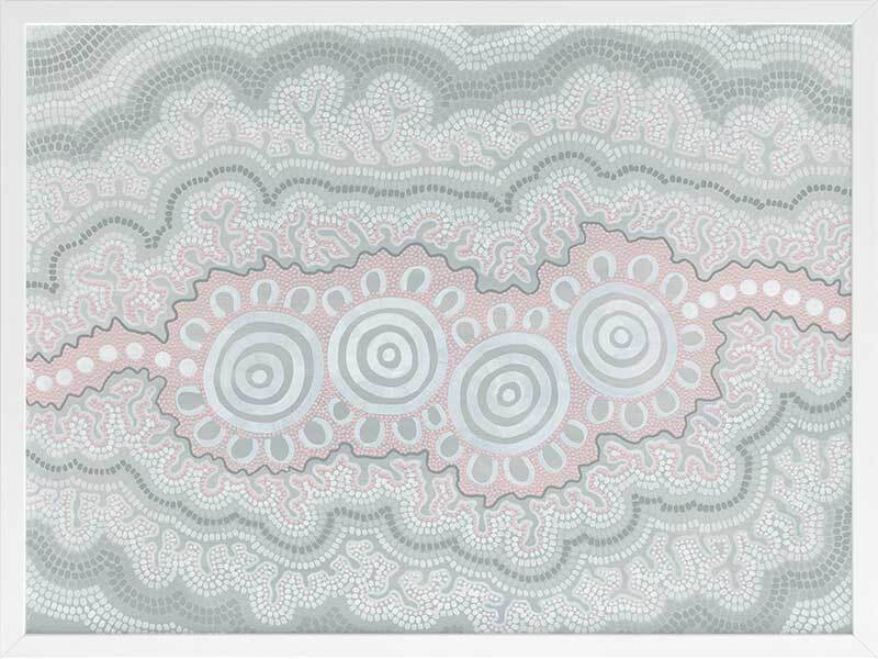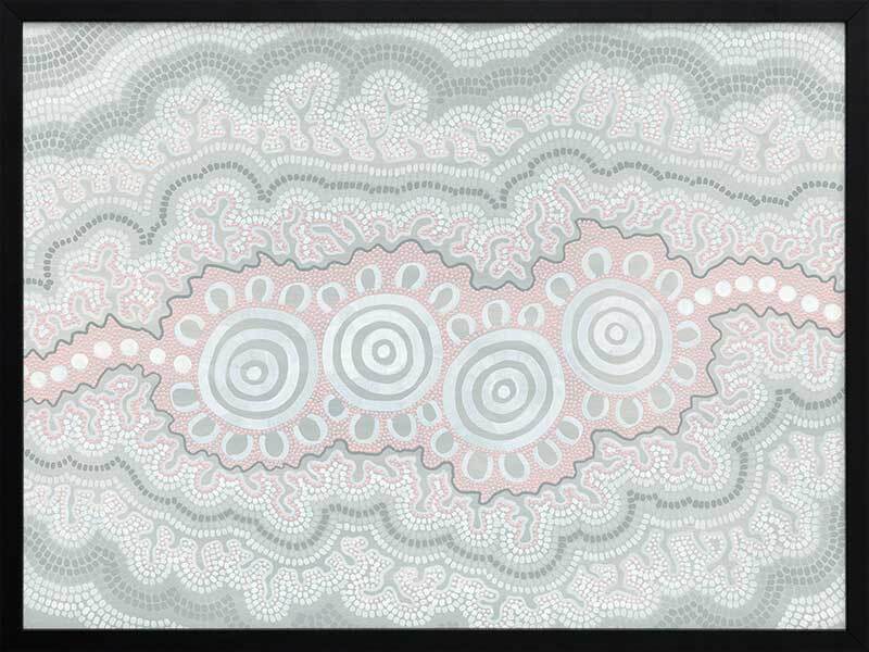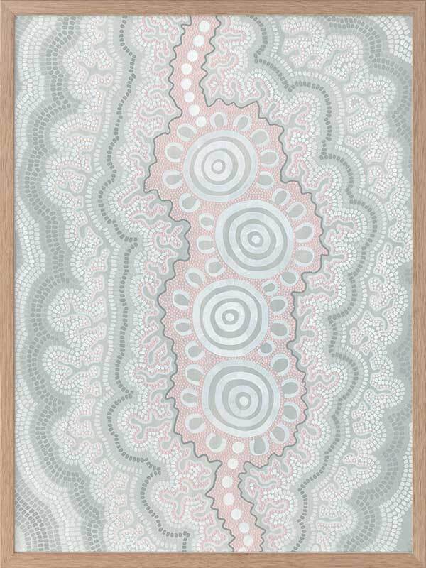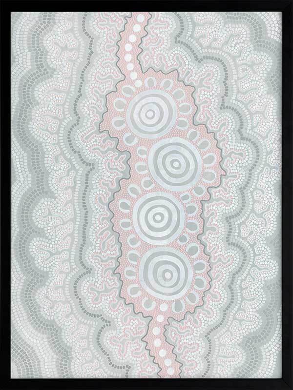 Gudidabaa - "Gathering Place". A kaleidoscope for the eyes, this traditional Aboriginal artwork represents those special moments when we gather with our loved ones to share memories and precious time. Using repeat patterns and unique rounded shapes, with a collection of spirals in the centre, this piece serves as a reminder of our connection with family and friends - people who surround us with love and through whom we seek comfort. A soft colour palette featuring light pink, blue and grey shades symbolises this comfort, which protects us when we need it most, and gives us strength for the foundations we build throughout our very lives.