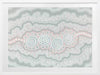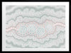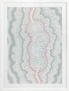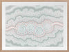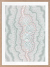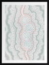 Gudidabba - Gathering Place Framed Art Print - Looking down, a birds eye view of another world, our sea, a place with so much going on underneath the stillness of the resting ocean's surface. Just coasting along, but so much to explore. This Indigenous Aboriginal artwork unifies the divine intricacy of traditional dot painting with a calming and subdued palette of blues, cream and pink, bringing a soothing energy to your space.