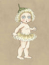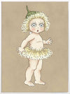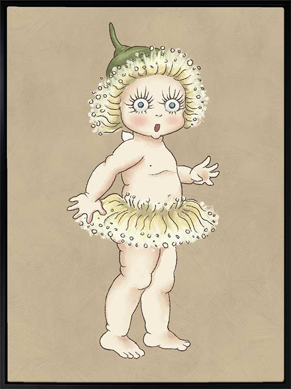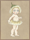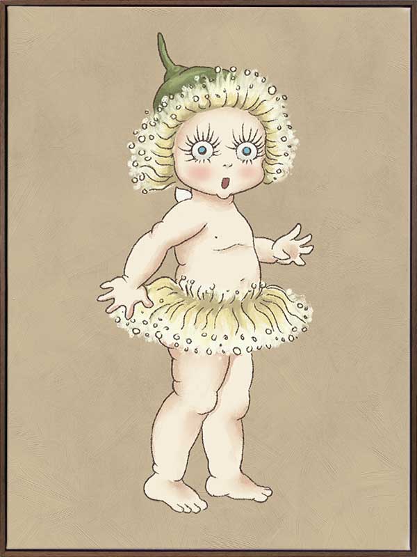 Gum Blossom Baby II Neutral Canvas Art Print - Caught mid-gasp, this charming Gum Blossom Baby seems to have discovered a secret only the bush knows. Her petal-fringed tutu and delicate green cap evoke the magic of the Australian flora, while her curious expression invites you to imagine the stories she might share.