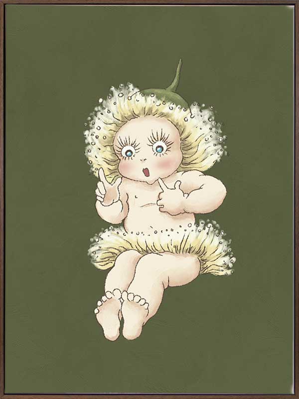 Gum Blossom Baby III Dark Green Canvas Art Print - Filled with carefree joy, this Gum Blossom Baby in this wall art from the Urban Road X May Gibbs Artwork Collection exudes the innocence and curiosity of childhood. A soft petal tutu and leafy cap perfectly capture the essence of Australia’s native flora, while a playful expression hints at adventures among the treetops.