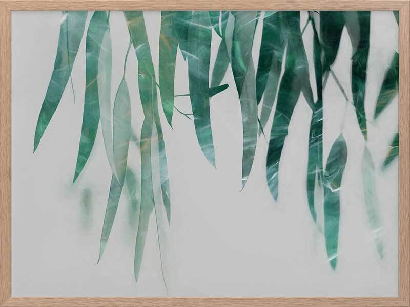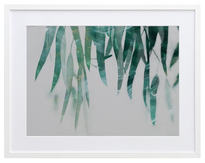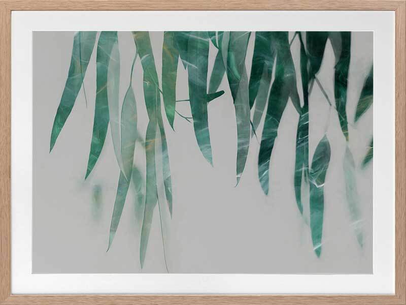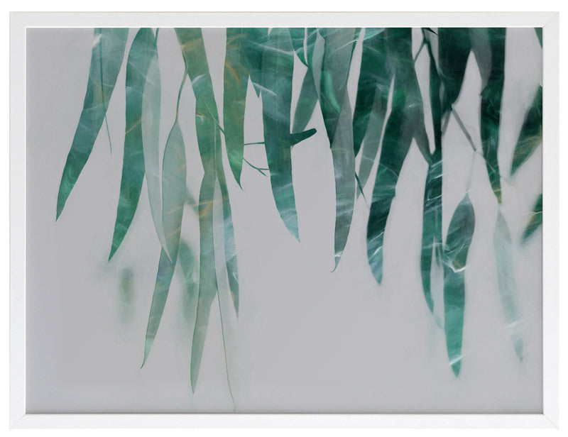 Gum Drop Framed - Abstract painting of Eucalyptus leaves hanging from a gumtree with emerald green leaves on a grey background, a modern twist on a floral still life. 2016 WINTER COLLECTION: INSPIRE