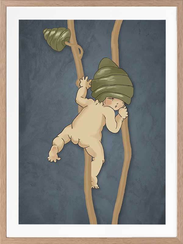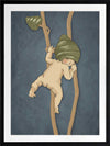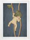 Gumnut Adventures II Blue Framed Art Print - Caught mid-climb, this bush baby teeters on the edge of adventure. This wall art from the Urban Road X May Gibbs Artwork Collection captures a moment of delicate curiosity in the untamed Australian bush.