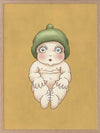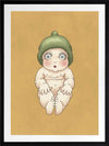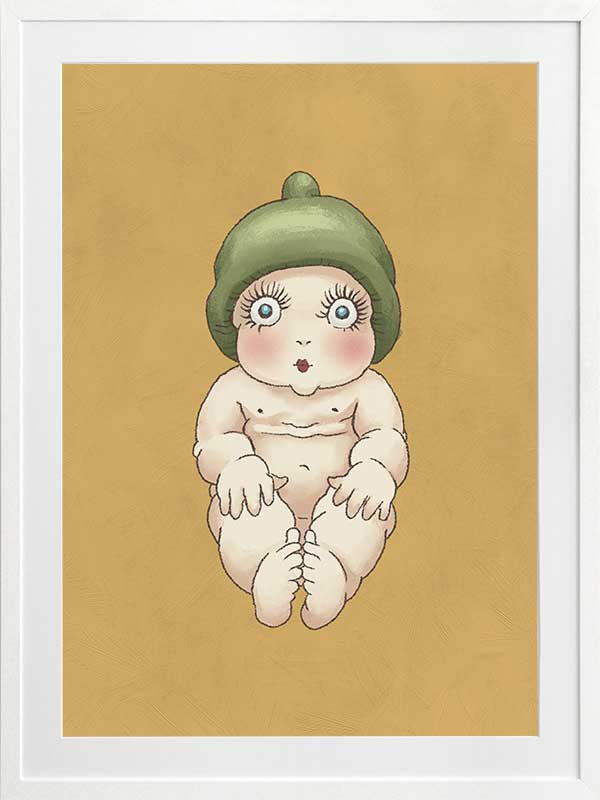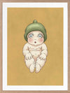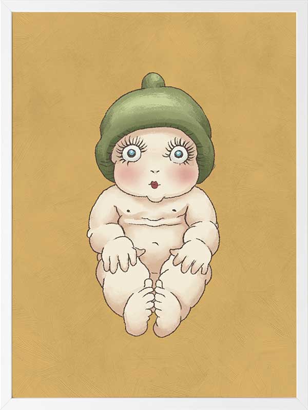 Gumnut Baby I Mustard Framed Art Print - Sitting with wide-eyed wonder, Snugglepot's courage and curiosity capture the spirit of May Gibbs’ beloved tales. The iconic green gumnut cap adds a touch of whimsy, while the soft mustard yellow backdrop keeps the focus on such adorable little features.