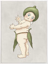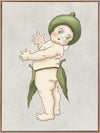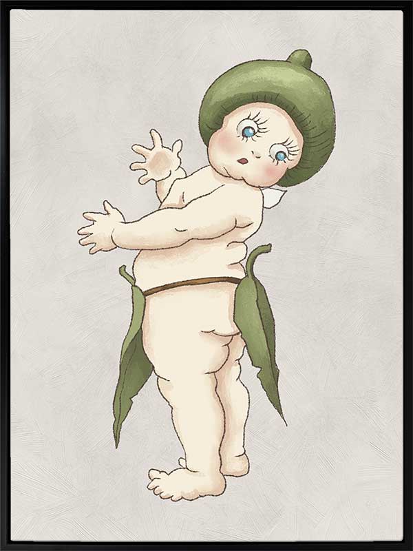 Gumnut Baby III Grey Canvas Art Print - Cheeky and full of spirit, Snugglepot stands ready to charm his way into your heart. With a playful twist of his tiny frame and a mischievous wave, this Gumnut Baby embodies the whimsy and wonder of May Gibbs’ beloved artwork and tales. Dressed in his signature gum leaf belt and acorn cap, Snugglepot is a true bushland treasure.