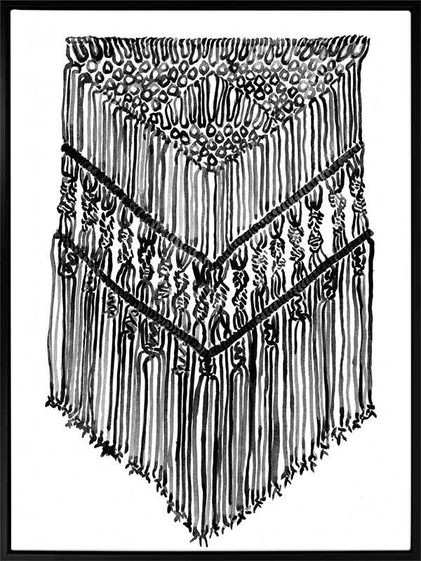 Gypsy Charcoal Canvas Art Print: A wonderfully detailed watercolour illustration of a bohemian macrame wall hanging in black and white. 2017 SPRING/SUMMER COLLECTION: RHAPSODY