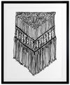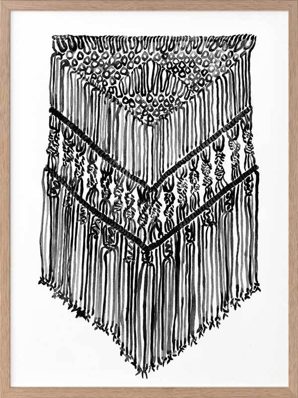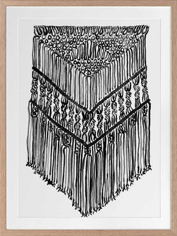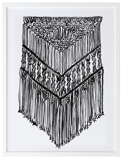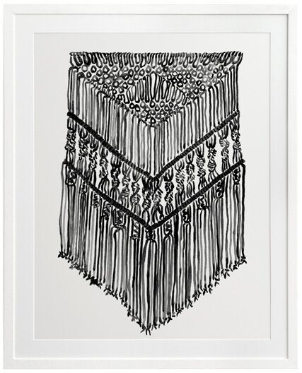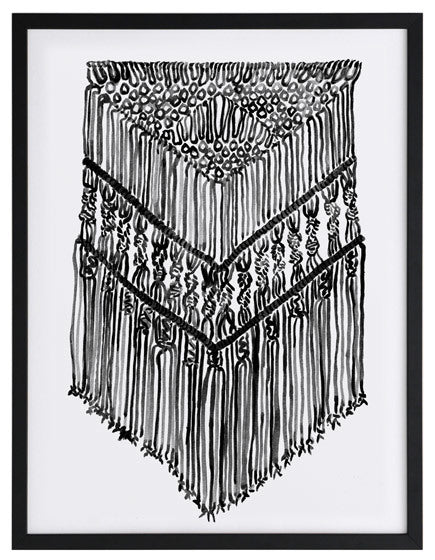 Gypsy Charcoal Framed Print: A wonderfully detailed watercolour illustration of a bohemian macrame wall hanging in black and white. 2017 SPRING/SUMMER COLLECTION: RHAPSODY