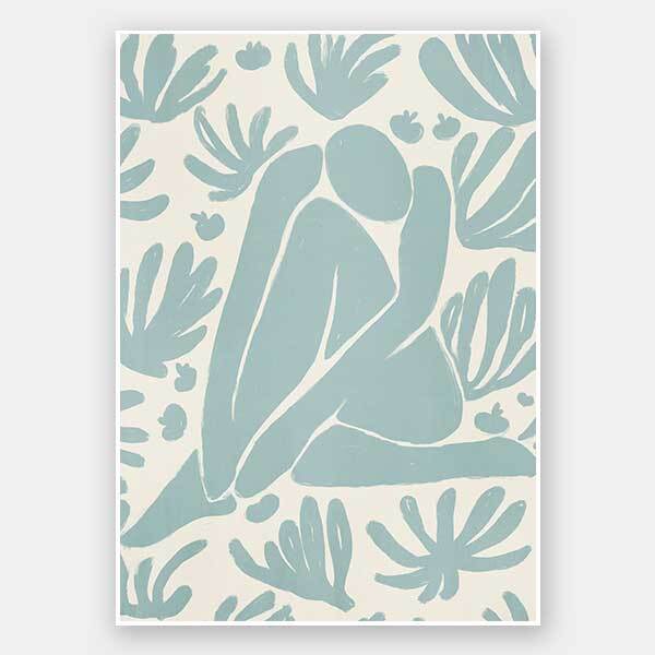 Haleness III Unframed Art Print - Derived from the abstract work of Matisse, this piece uses a powder blue shade complimenting a soft cream background. Featuring a human figure in the centre, sitting among organic leaf-like shapes, an overwhelming sense of serenity comes across with thoughtful, smooth brush strokes and uneven linework. An understated energy that brings character to any wall, suitable for most interior styles.