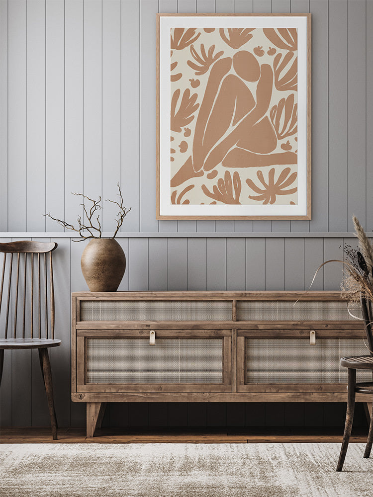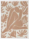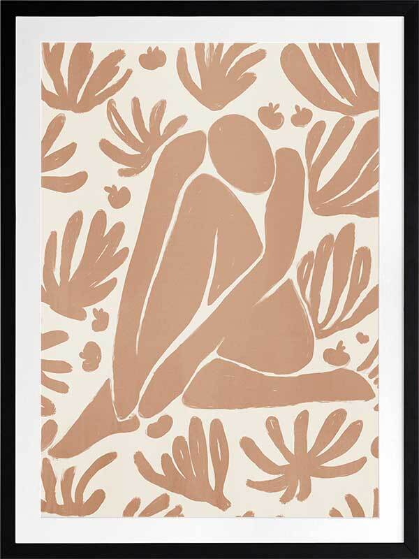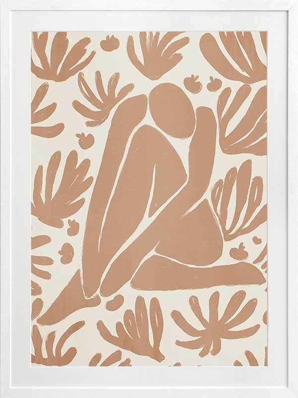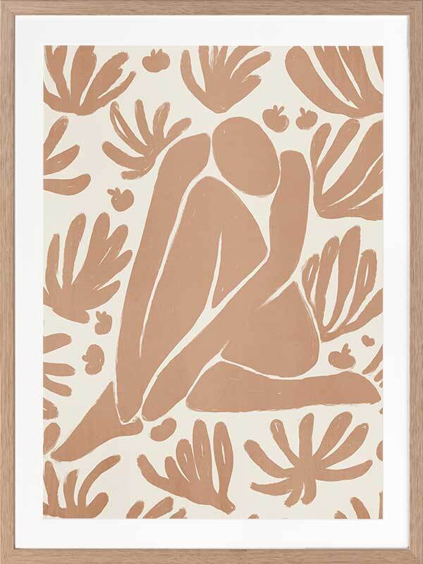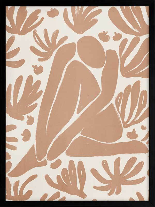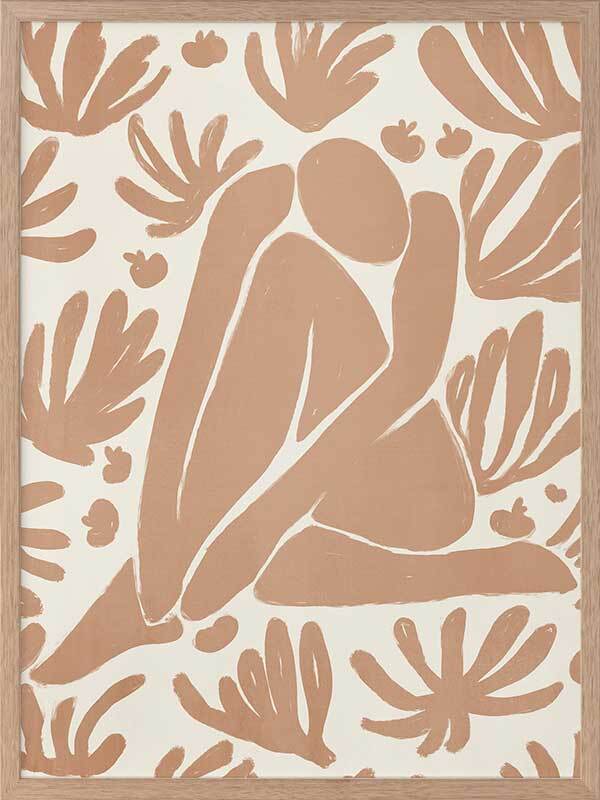 Haleness V Framed Art Print - Derived from the abstract work of Matisse, this piece uses a light burnt orange shade complimenting a soft cream background. Featuring a human figure in the centre, sitting among organic leaf-like shapes, an overwhelming sense of serenity comes across with thoughtful, smooth brush strokes and uneven linework. An understated energy that brings character to any wall, suitable for most interior styles.