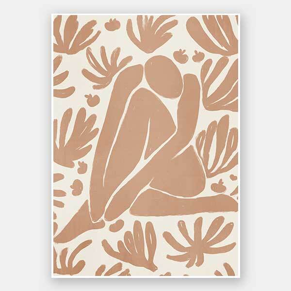 Haleness V Unframed Art Print - Derived from the abstract work of Matisse, this piece uses a light burnt orange shade complimenting a soft cream background. Featuring a human figure in the centre, sitting among organic leaf-like shapes, an overwhelming sense of serenity comes across with thoughtful, smooth brush strokes and uneven linework. An understated energy that brings character to any wall, suitable for most interior styles.