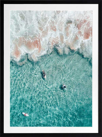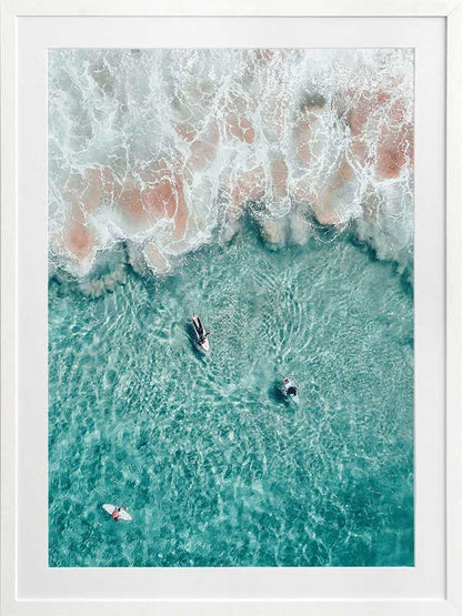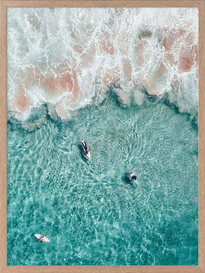 Hang Ten - A stunning photographic piece looking down onto surfers in crystal clear waters.