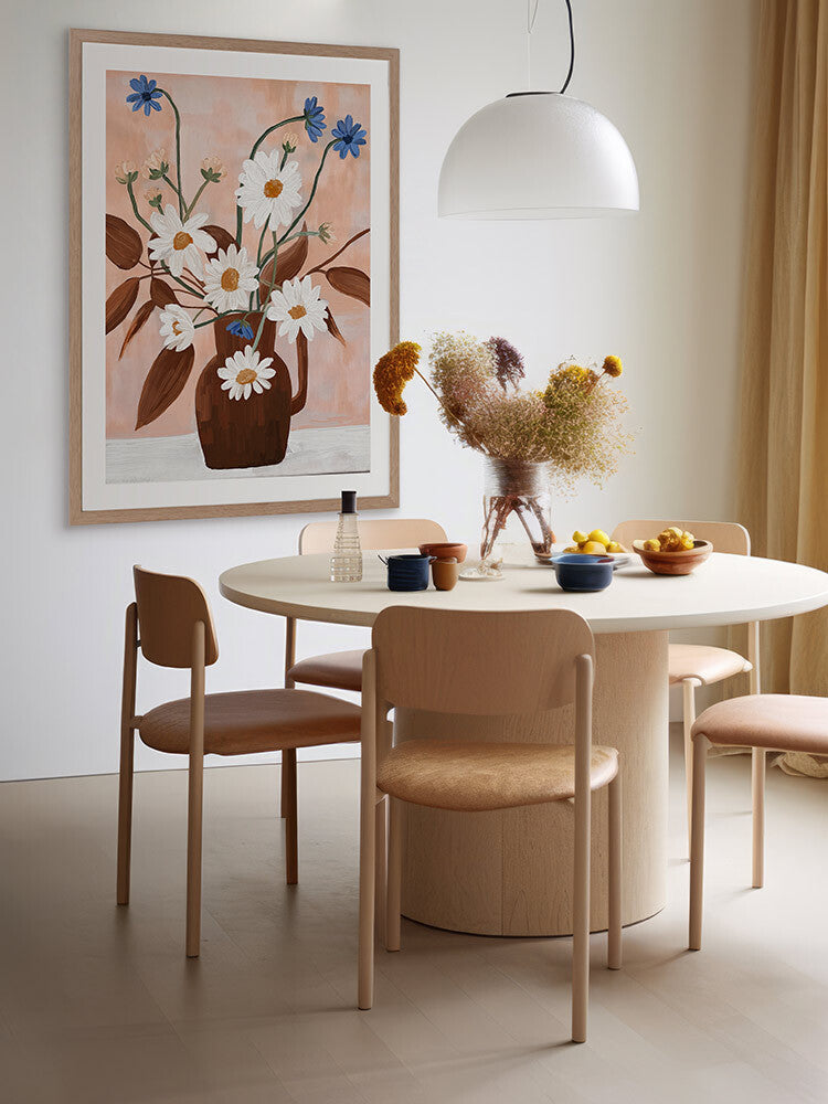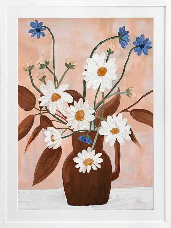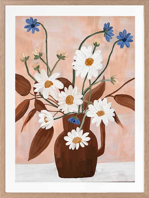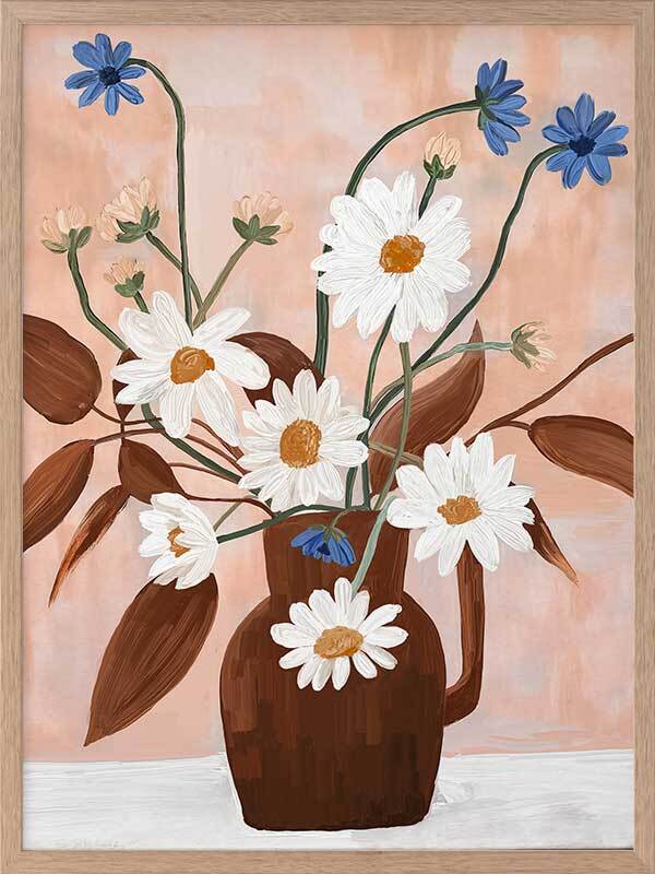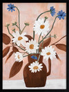 Happiness in a Vase I Framed Art Print - This floral and botanical artwork captures the simplicity and beauty of nature with a bouquet of daisies and blue flowers in a brown vase. Set against a soft peach background, the vibrant white petals and green stems create a fresh and cheerful mood. Ideal for adding a touch of botanical elegance to any space.