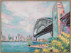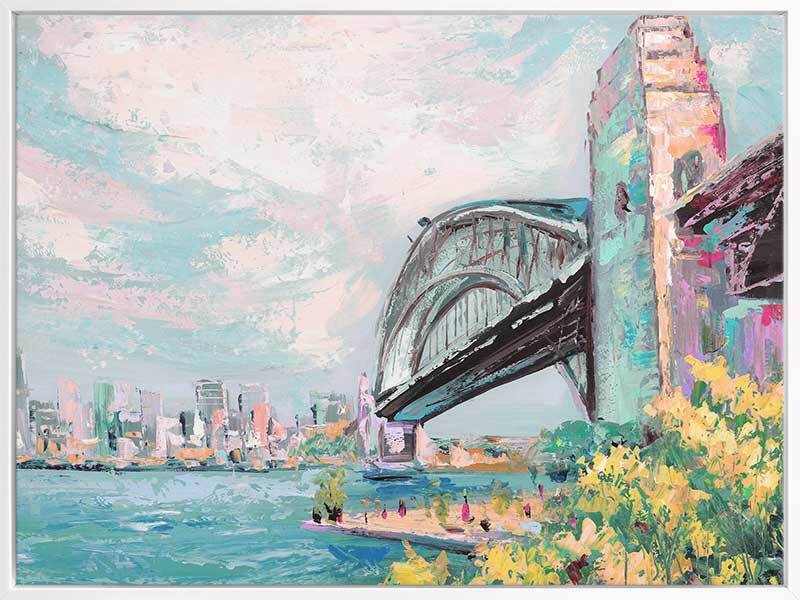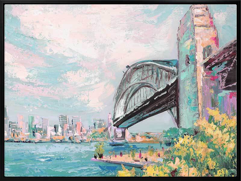 Harbour Bridge Canvas Art Print - A wonderfully textured piece featuring the iconic Sydney Harbour Bridge beneath a fairy floss sky of blue and pink clouds.