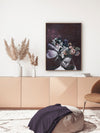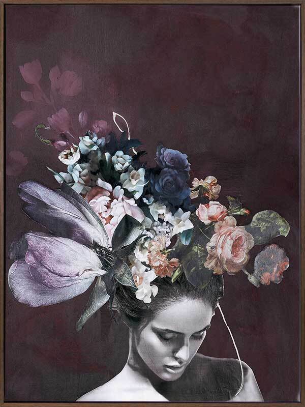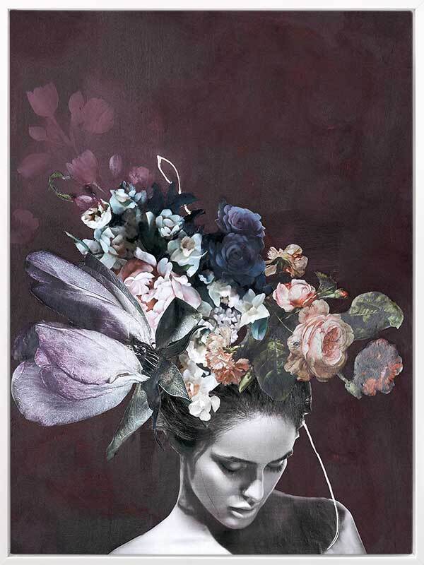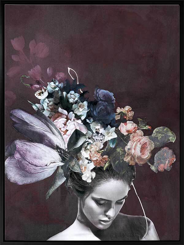 Haute Couture I Canvas Art Print - With its moody colour palette, this breathtaking piece captures the essence of strong feminine energy, with a dynamic burst of freshly bloomed flowers. Against the rich, earthy burgundy backdrop with organic brush strokes sits a greyscale female figure, with soft purples, oranges, greens, and blues within the flowers.