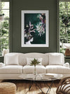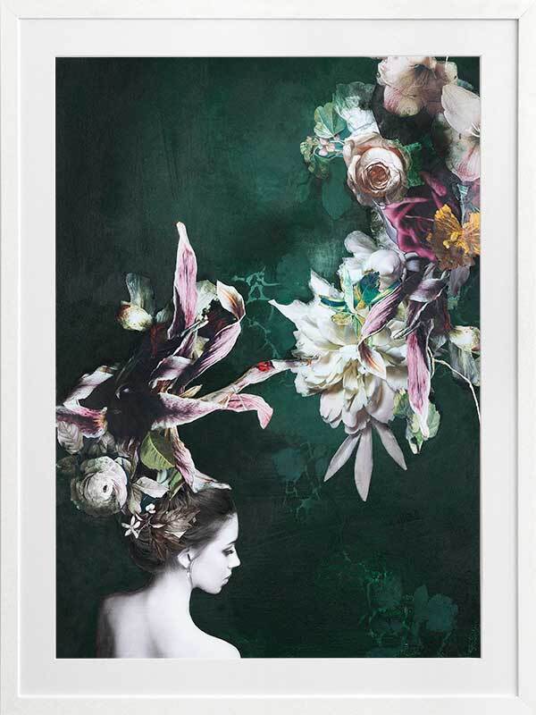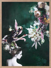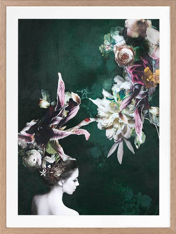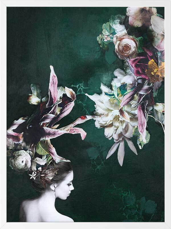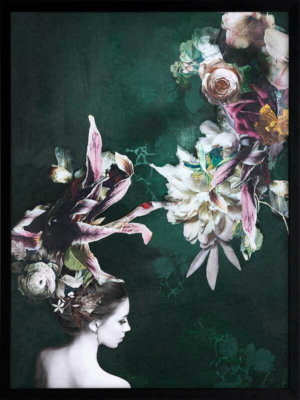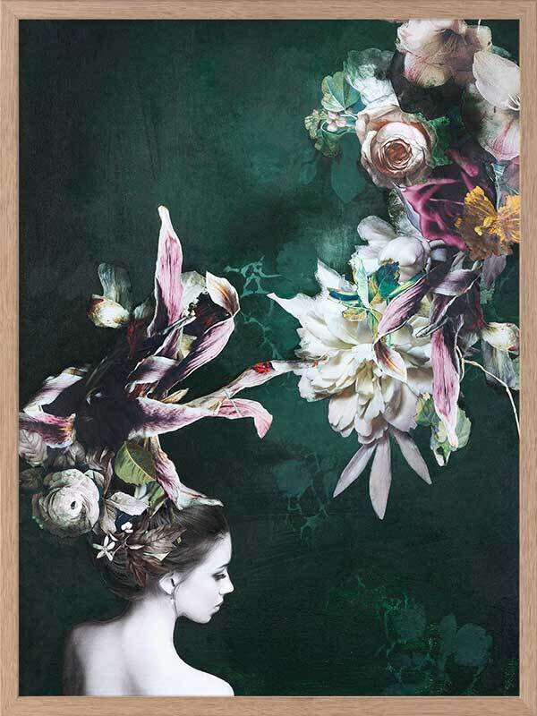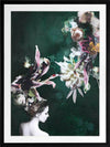 Haute Couture II Framed Art Print - With its moody colour palette, this breathtaking piece captures the essence of strong feminine energy, with a dynamic burst of freshly bloomed flowers. Against the rich, jewel toned green backdrop with organic brush strokes sits a greyscale female figure, with soft pinks, oranges, greens, and blues within the flowers.