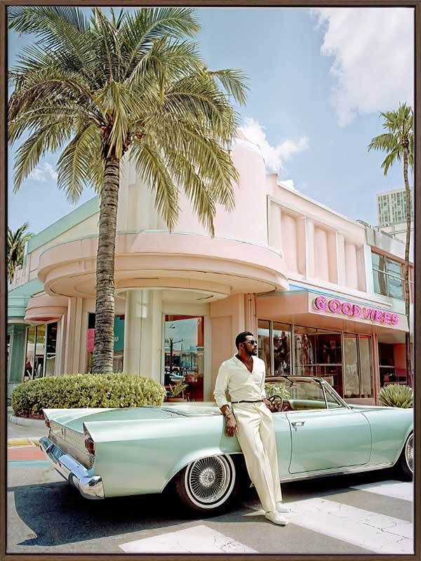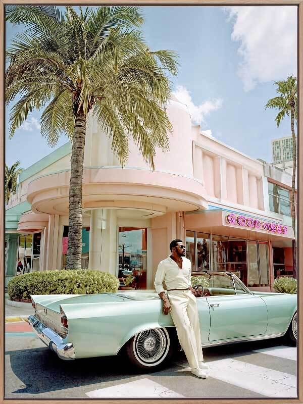 Havana Days Canvas Art Print - This vibrant artwork transports your space to a day in sun-soaked Havana, Cuba, where a stylish man leans against a vintage car in front of a pastel building, capturing the essence of glamour and mid-century luxury. Palm trees sway in the background, adding to the idyllic vision, while soft pinks, greens, and creams evoke a breezy elegance. The blend of Art Deco architecture, classic fashion, and vintage car design exudes retro charm, bringing warmth and a sense of escape to any space. Whether for a living room or bedroom, this limited edition wall art from Shaynna Blaze's exclusive collection invites you to embrace timeless sophistication.
