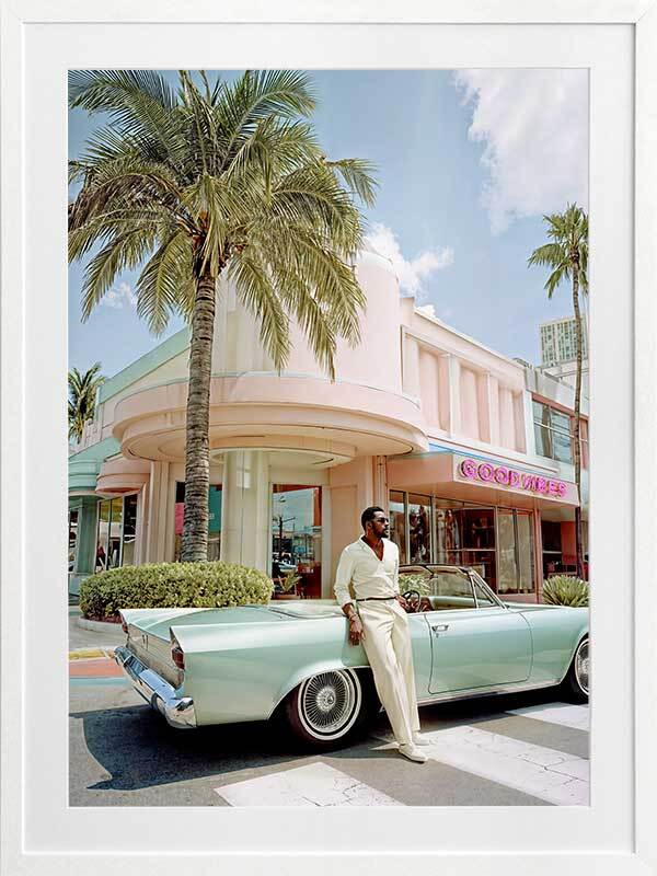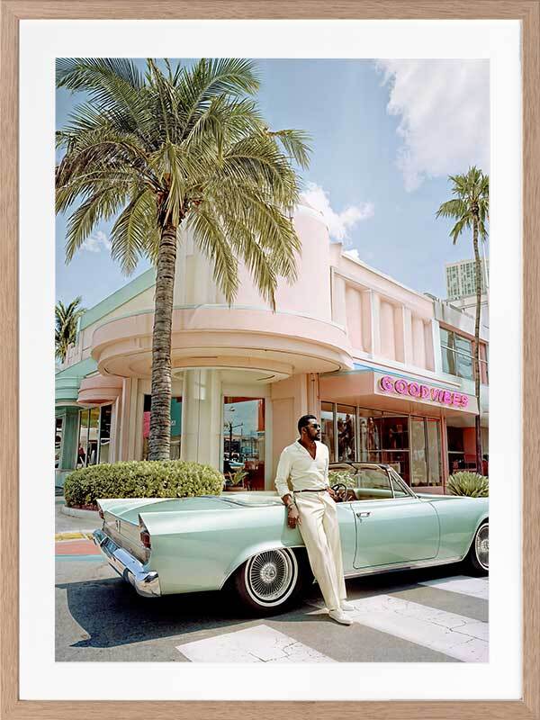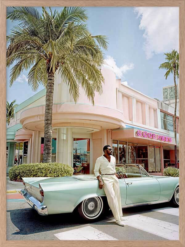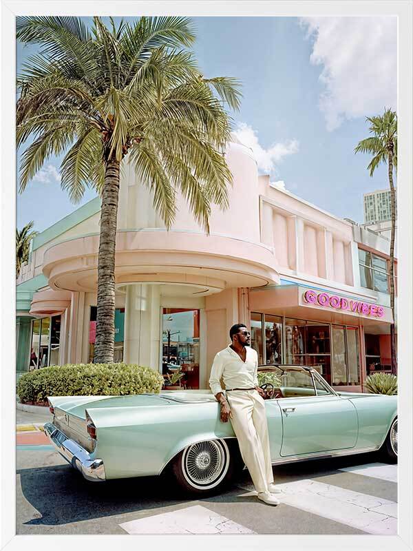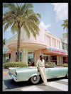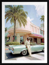Havana Days Framed Art Print - This vibrant artwork transports your space to a day in sun-soaked Havana, Cuba, where a stylish man leans against a vintage car in front of a pastel building, capturing the essence of glamour and mid-century luxury. Palm trees sway in the background, adding to the idyllic vision, while soft pinks, greens, and creams evoke a breezy elegance. The blend of Art Deco architecture, classic fashion, and vintage car design exudes retro charm, bringing warmth and a sense of escape to any space. Whether for a living room or bedroom, this limited edition wall art from Shaynna Blaze's exclusive collection invites you to embrace timeless sophistication.