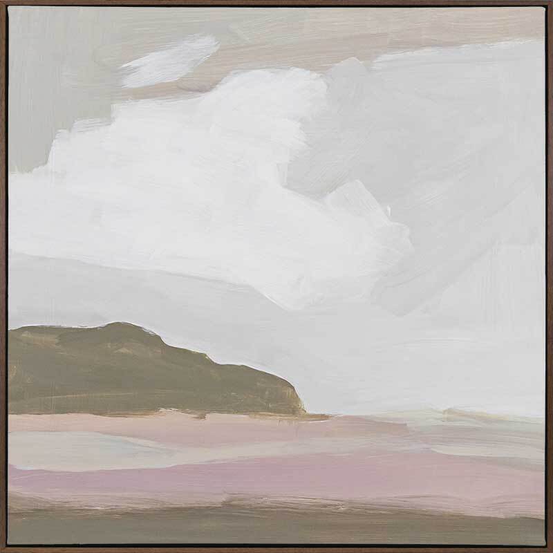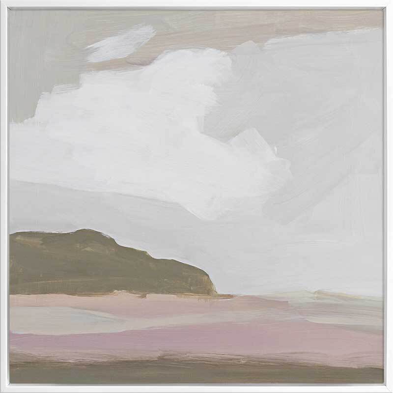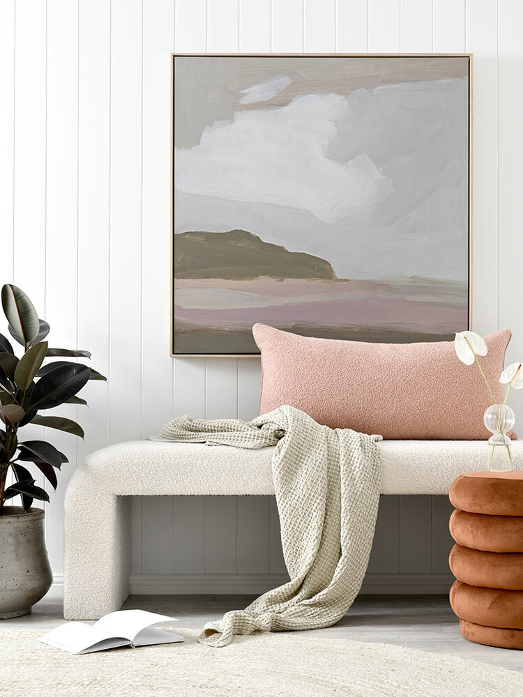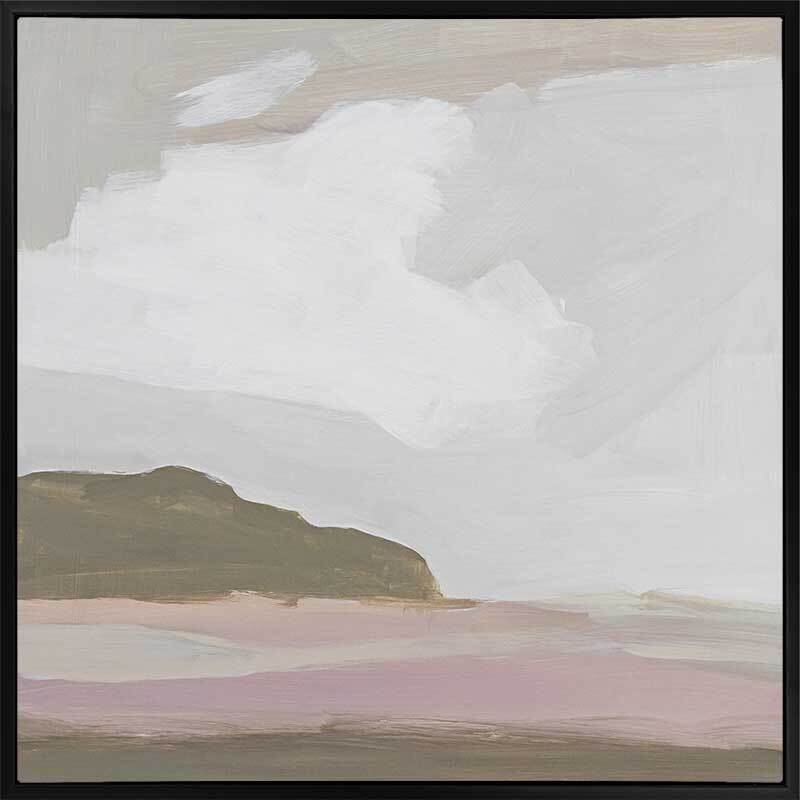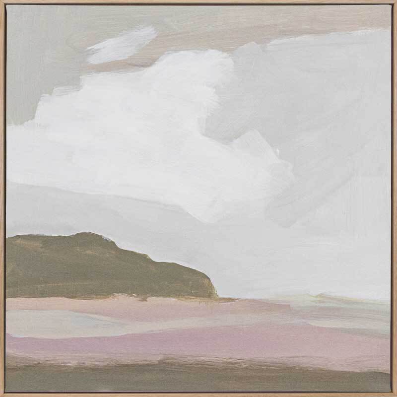 Headland Canvas Art Print - Under an imposing white cloud where sky meets sea the headland intercepts, creating a rocky shore for waves to crash - and play out nature's great drama. Sit back and take in soft pink, gentle grey and brown, a naturally soothing palette, and wide, generous paint strokes. Complimentary muted tones of stone, white and dusty pink create a dramatic yet harmonious piece to showcase in your living space.