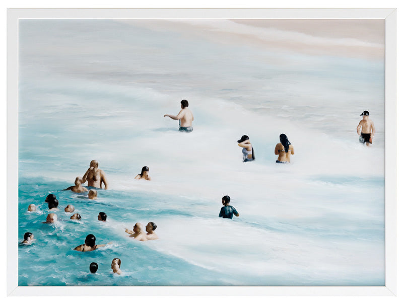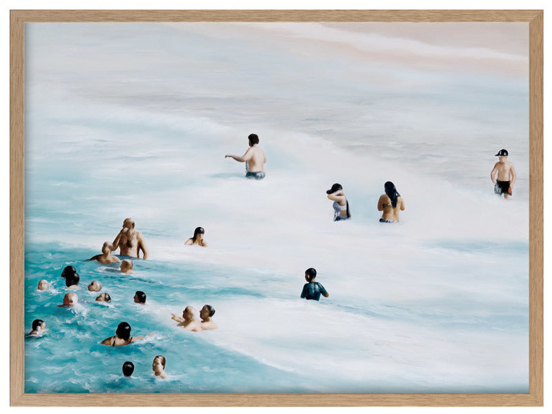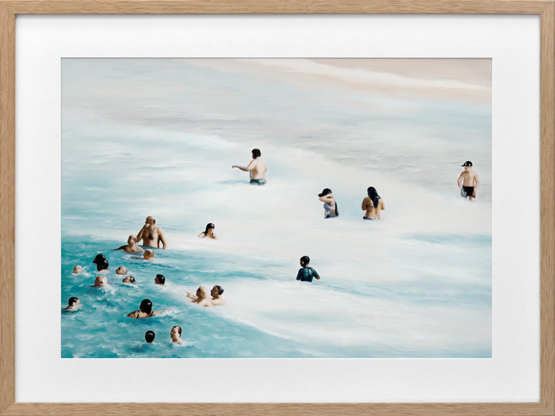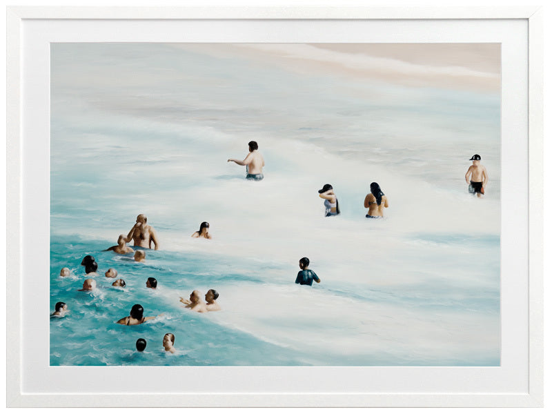 Heatwave Framed Print: The quintessential Australian Summer. A striking artwork featuring a group of people cooling off in foamy, blue waves. 2018 SPRING/SUMMER COLLECTION: REMINISCE