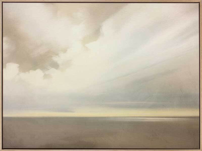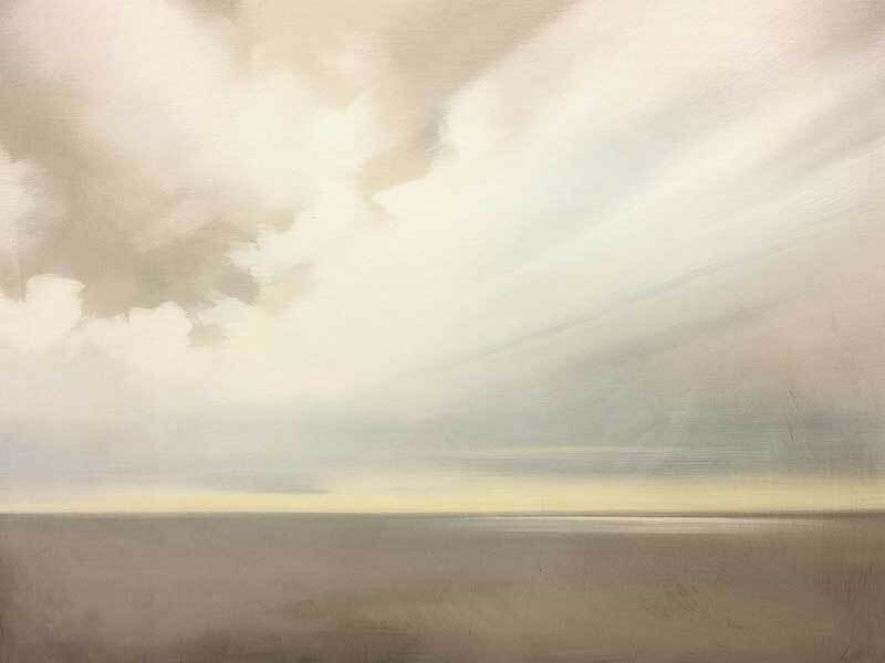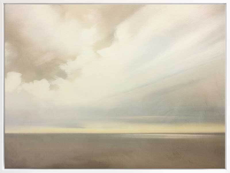Heavenly Hues Canvas Art Print - A vast stretch of sky, bathed in soft tones of cream-toned white and beige, overlooks a bare field, seamlessly blending with streaks of light blue and yellow. This delicate landscape wall art evokes a profound sense of serenity, with a minimalist design that suits any interior style.