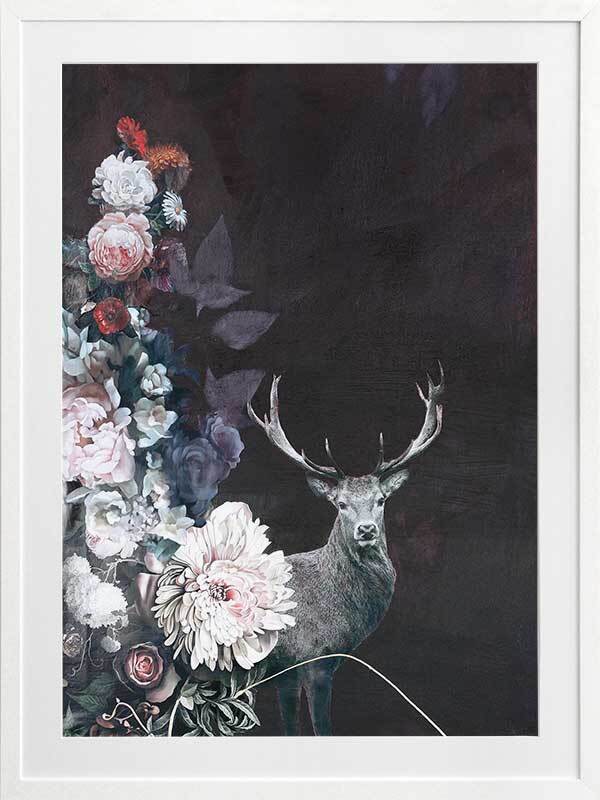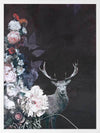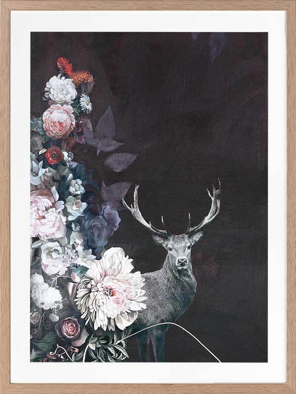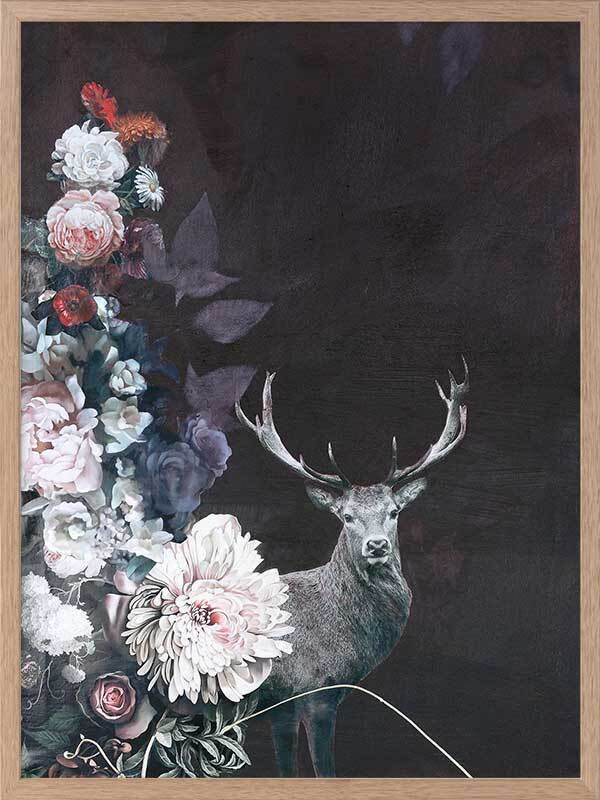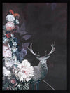 Hide and Seek I Framed Art Print - This timid deer takes a peek through the blooming flora, waiting for its next move, surrounded by the fresh scent of dew drops and wet tree bark close by. A warm undertone dominates the colour palette, with a deep burgundy red backdrop, followed by pops of warm pinks, oranges, yellows, and blue and purple in the foreground.