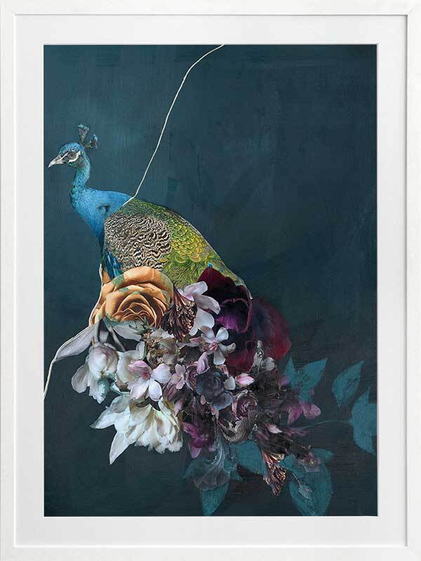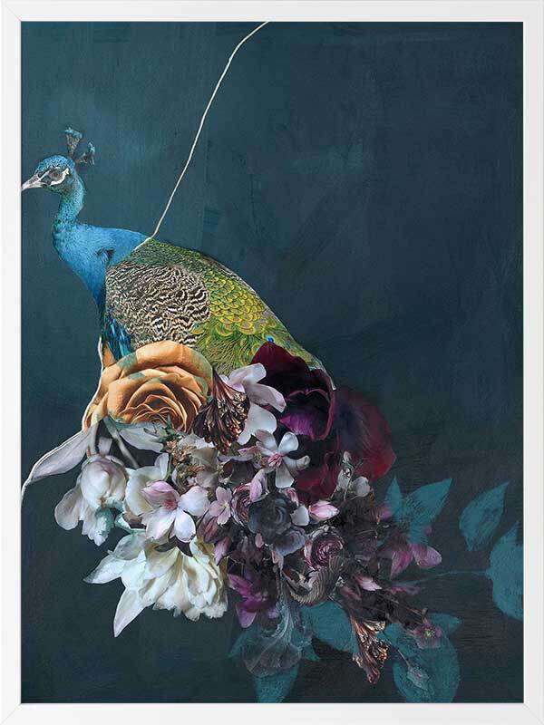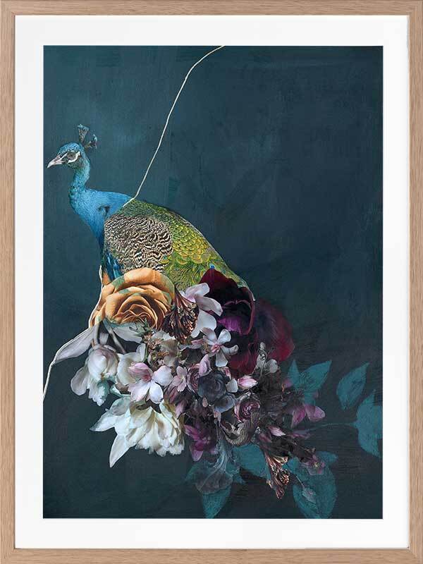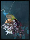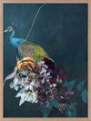 Hide and Seek II Framed Art Print - This fearless peacock waits patiently among the blooming flora, surrounded by their fresh scent as he waits for his next move. A cool undertone dominates the colour palette, with a soft green-blue backdrop, followed by pops of deep red, soft orange, pink, and creamy white in the foreground for a sense of warmth.