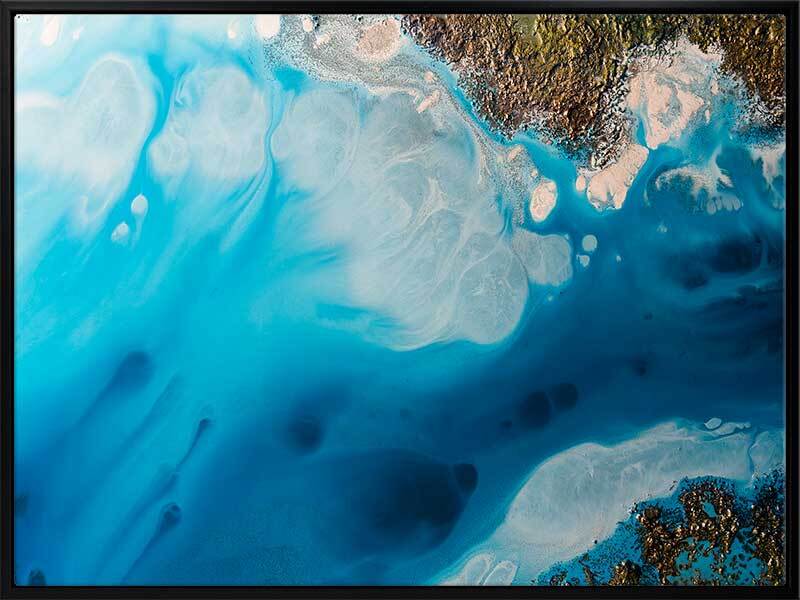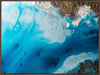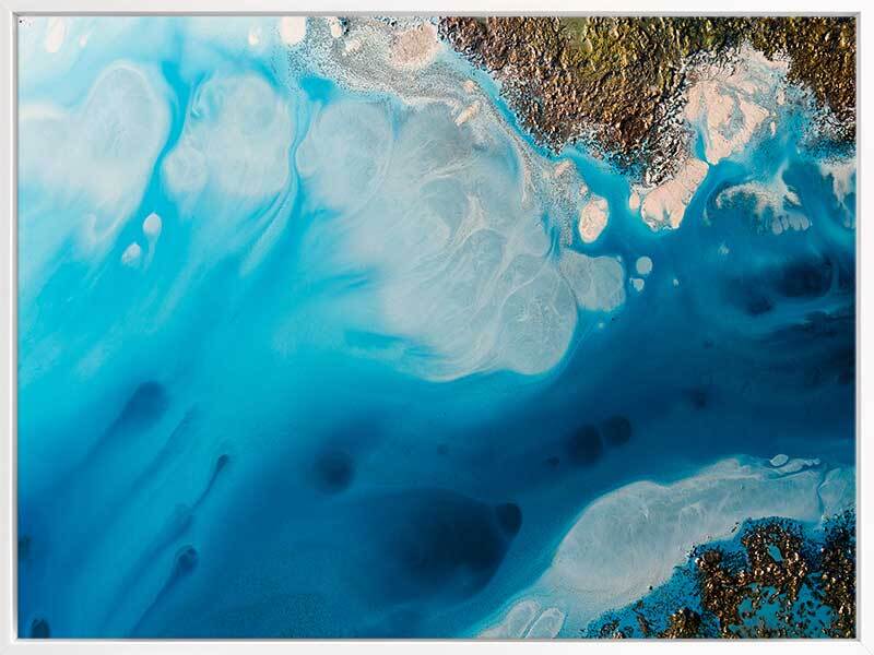 High Tide Canvas Art Print - Beautiful and flowing, this artwork blends deep and royal blue tones with clouds of white and gold accents. A beautiful coastal style piece that is reminiscent of an aerial ocean current.