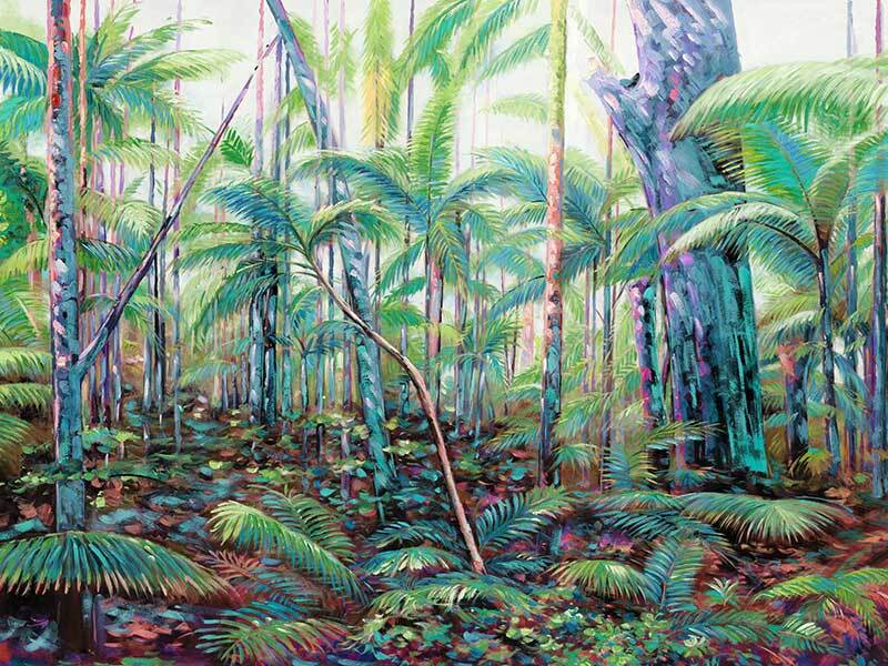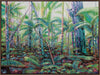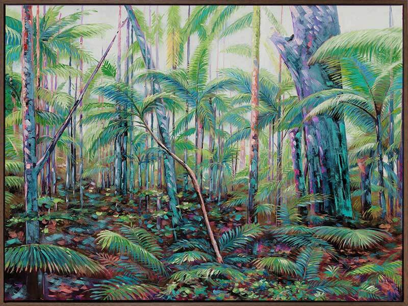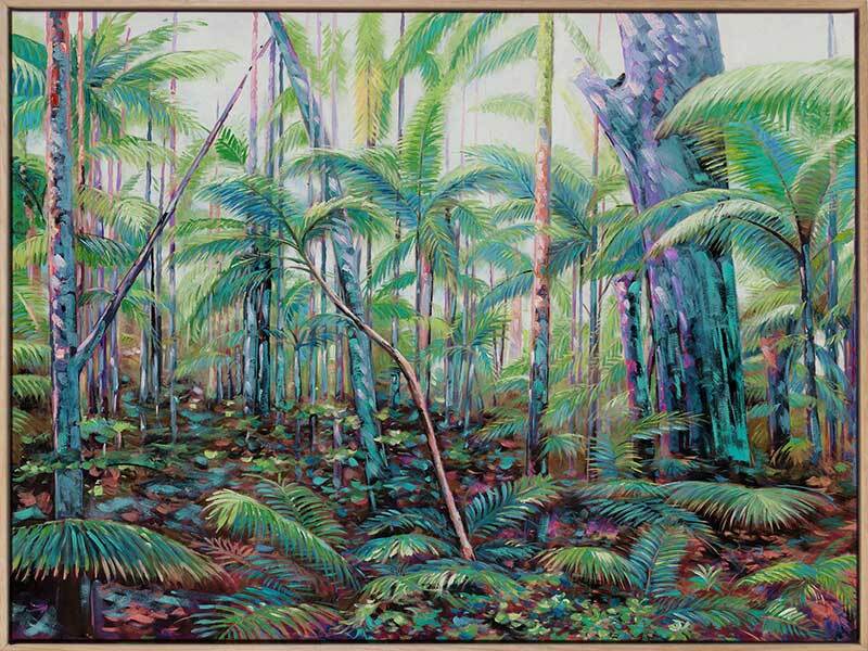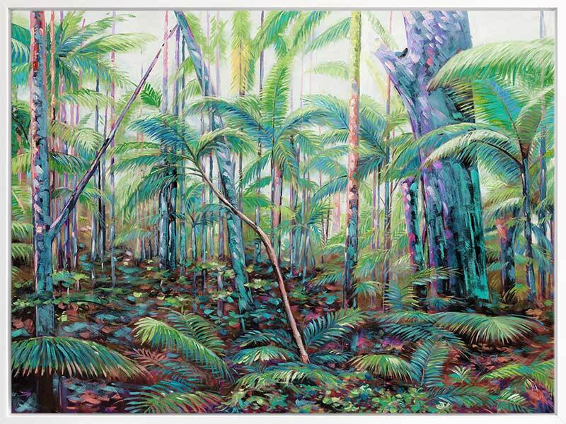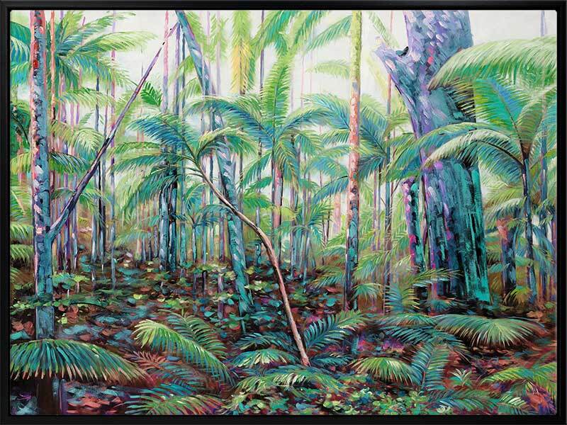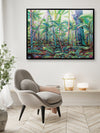 Hinterland Canvas Art Print - A lush and vibrant artwork, featuring a quintessential tropical Australian rainforest. The piece showcases layers of trees and foliage in a bright green colour palette accented with neon highlights.
