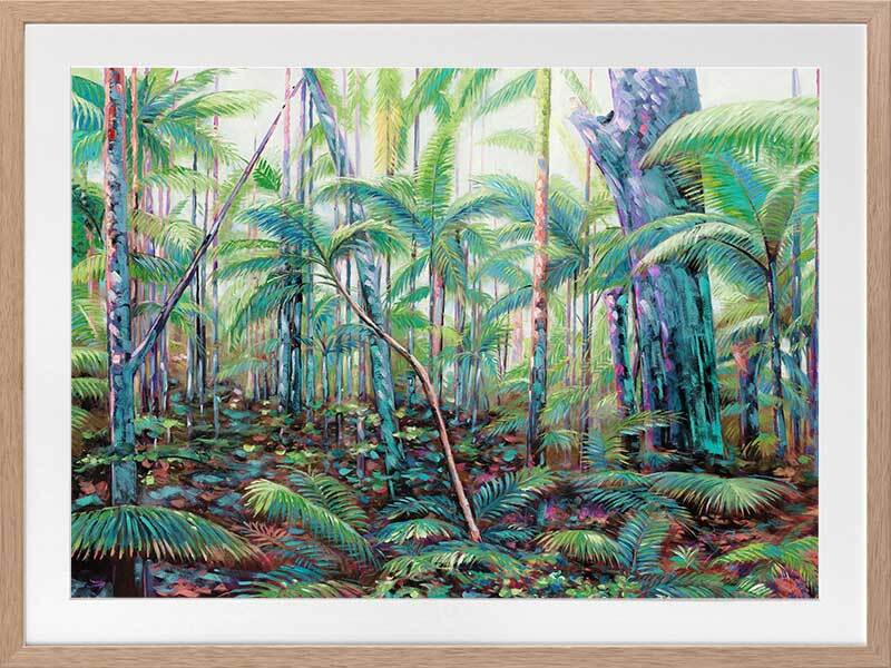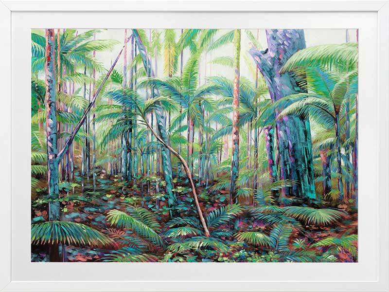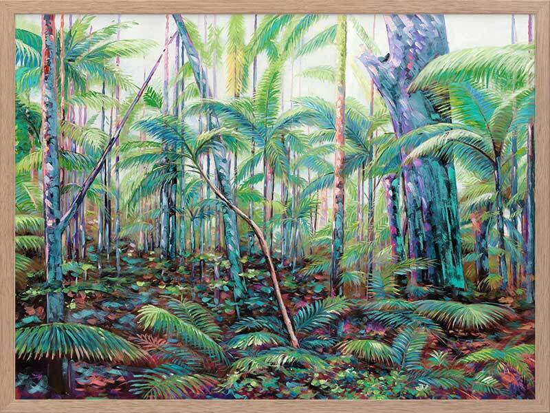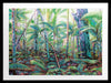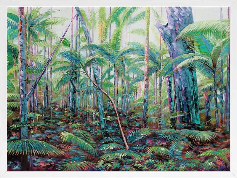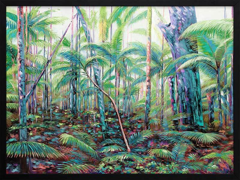 Hinterland Framed Art Print - A lush and vibrant artwork, featuring a quintessential tropical Australian rainforest. The piece showcases layers of trees and foliage in a bright green colour palette accented with neon highlights.