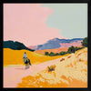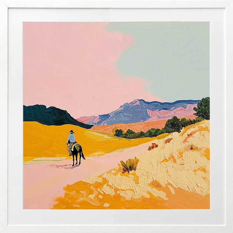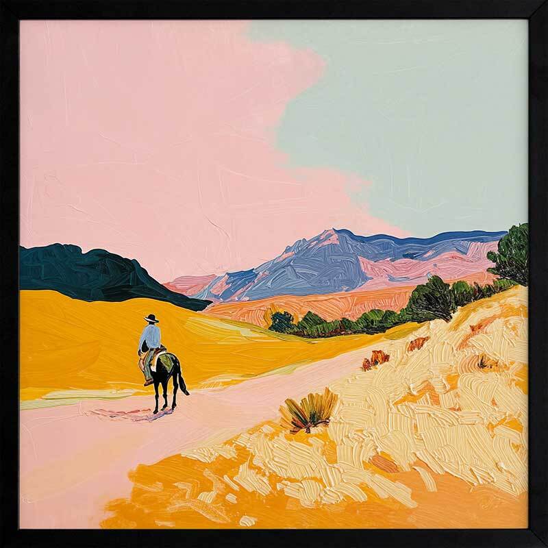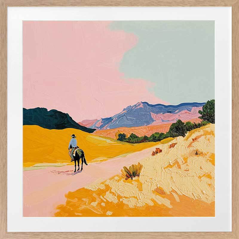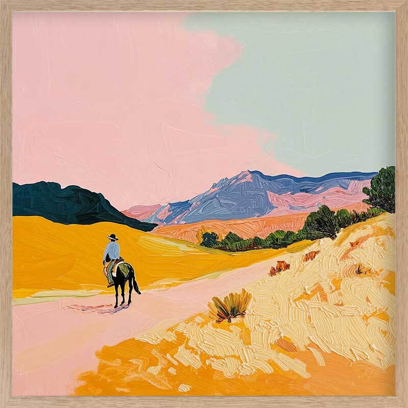 Homewood Bound Framed Art Print - A playful twist on the typical American Western landscape, this breathtaking country-themed artwork of a cowboy on his horse, surrounded by picturesque mountains in the dusty desert, is the perfect way to uplift your space with bright pastel shades of pink, green, blue, and orange.