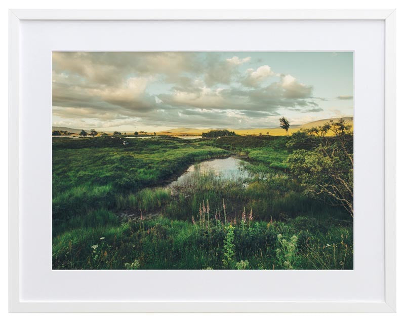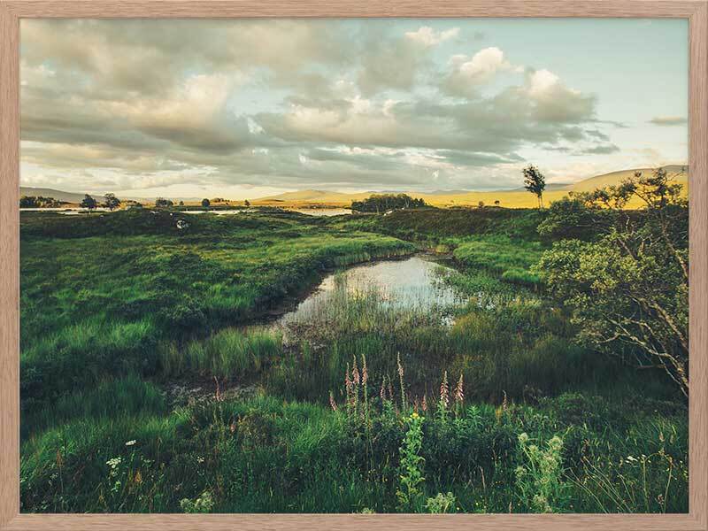 Horizon Framed - Green landscape surrounding a pond with greens, yellows and blues. 2016 WINTER COLLECTION: INSPIRE