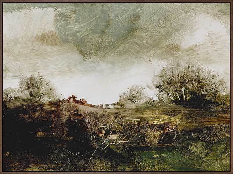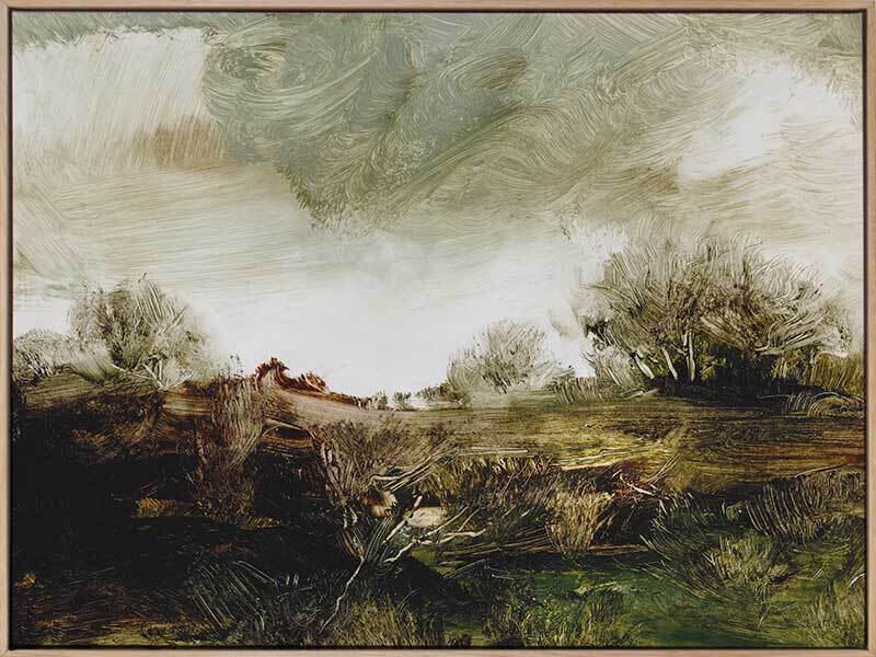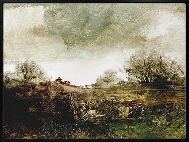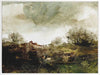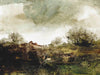 Hound Tor Canvas Art Print - A favourite of Hobday's, this landscape piece is of a local area called 'Hound Tor' in Dartmoor, Devon. It features a relaxing landscape of rolling green hills with a stormy grey sky. Brush strokes are very evident in this piece and create a more detailed and moody atmosphere.
