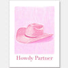 Howdy Partner Unframed Art Print - A playful nod to Western nostalgia, this retro poster art print by Jenny Liz Rome brings a modern twist to classic cowboy culture. Featuring a bold pink cowboy hat against a textured background, this artwork is a statement-maker in any space. Ideal for those who love boho style wall art with a touch of Americana, it effortlessly blends with many interior styles. Whether styled in a country-inspired setting or a contemporary bohemian art collection, this piece adds a fun and charismatic charm to your decor.